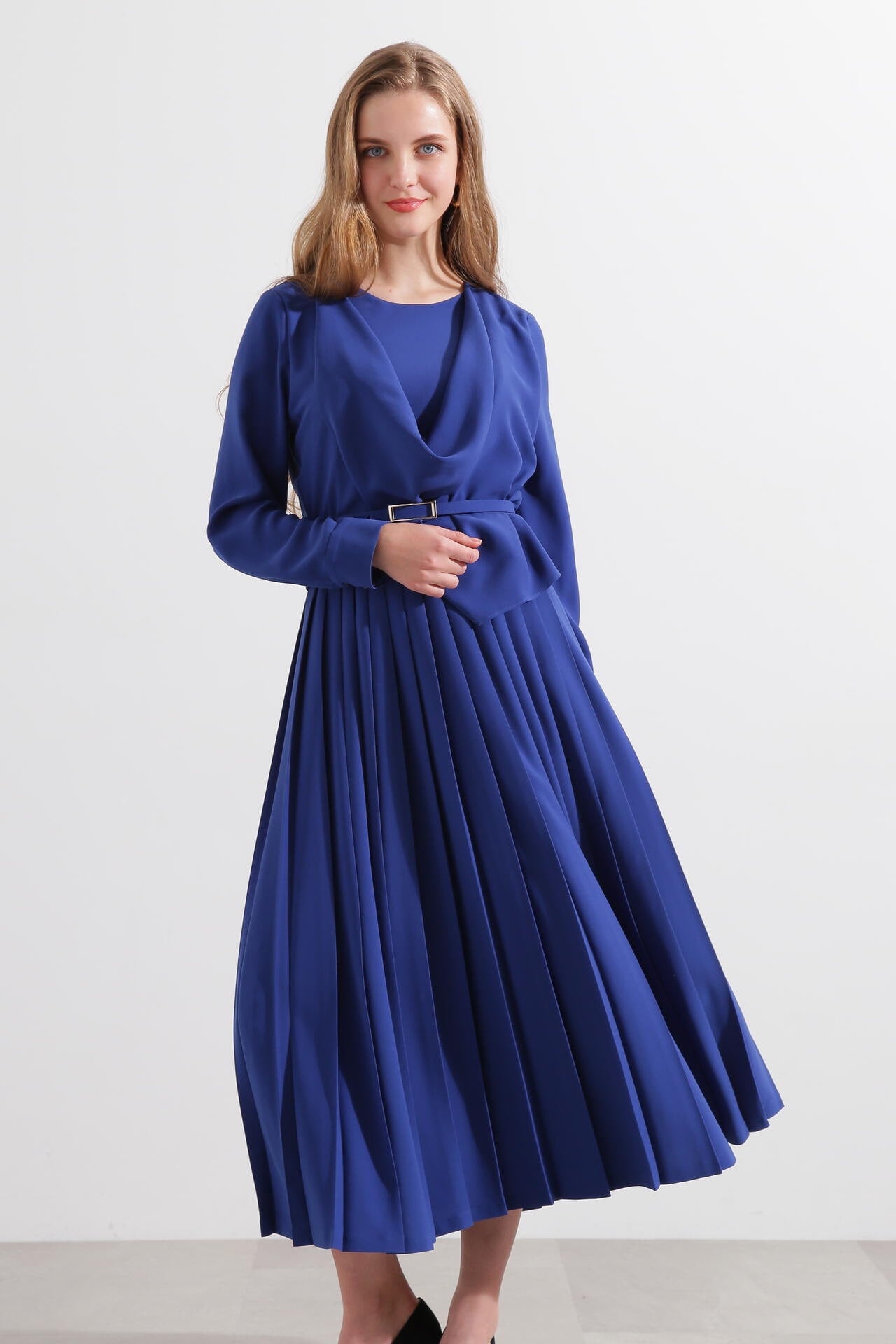 独特のカッティングでフロントに自然なドレープを作り、女性らしさを引き立てたドレープワンピース。背面のコンシールファスナーと調節可能なウエストベルトにより、美しいフィット感のあるシルエットに仕立てました。またスカート部分はプリーツデザインになり、広がりすぎないAラインシルエットなので甘くなりすぎず、大人な印象です。 通勤にも、洗練されたビジネスウェアとしても、シーンを選ばない一着です。