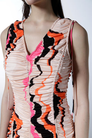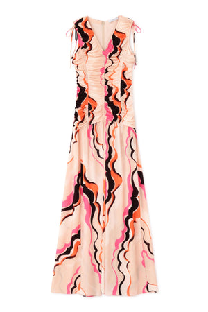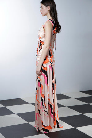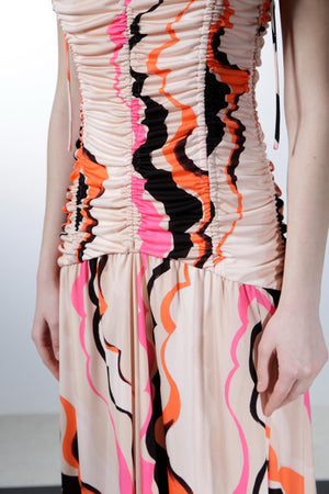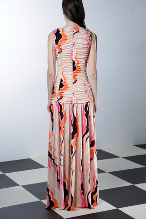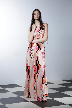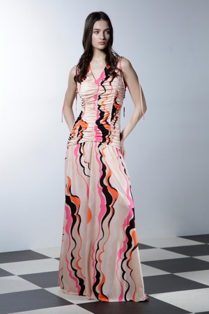 大胆なカラーパレットと流れるようなパターンが遊び心を引き立てるロングドレス。深いVネックとギャザーデザインが立体感を生み、フィットしたボディから床まで広がるスカートがドラマティックなシルエットを演出します。洗練された華やかさとシックな魅力を放つ一着です。