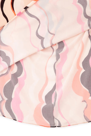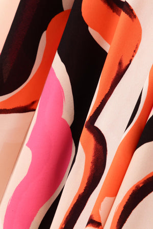 プリントのベースにはしっとりとした質感とドレープ性が特徴のカットソー素材を使用。プリントは大胆で流れるような抽象模様が施され、柔らかな印象のベージュに、黒、ピンク、オレンジの色合いを用いて、遊び心に溢れた魅力的な雰囲気に仕上げました。