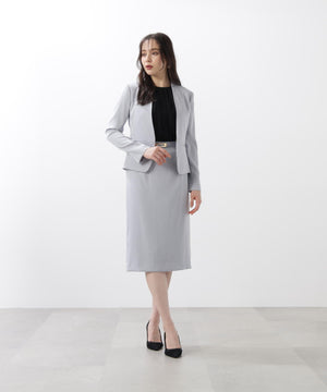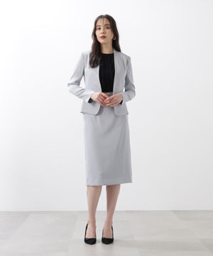トリアセ混で、上品なハリ感のある素材を使ったジャケットです。ノーカラー、ノーボタンのコンパクトな作りで、シャープな印象。無駄なデザインをそぎ落とし、すっきりとしたシルエットにこだわった、PINKY&DIANNE定番のジャケットです。今期は、前を閉めると前身頃が少しだけ重なるデザインで、開けたときにゴールドのホックがアクセントになるよう、アップデートしています。