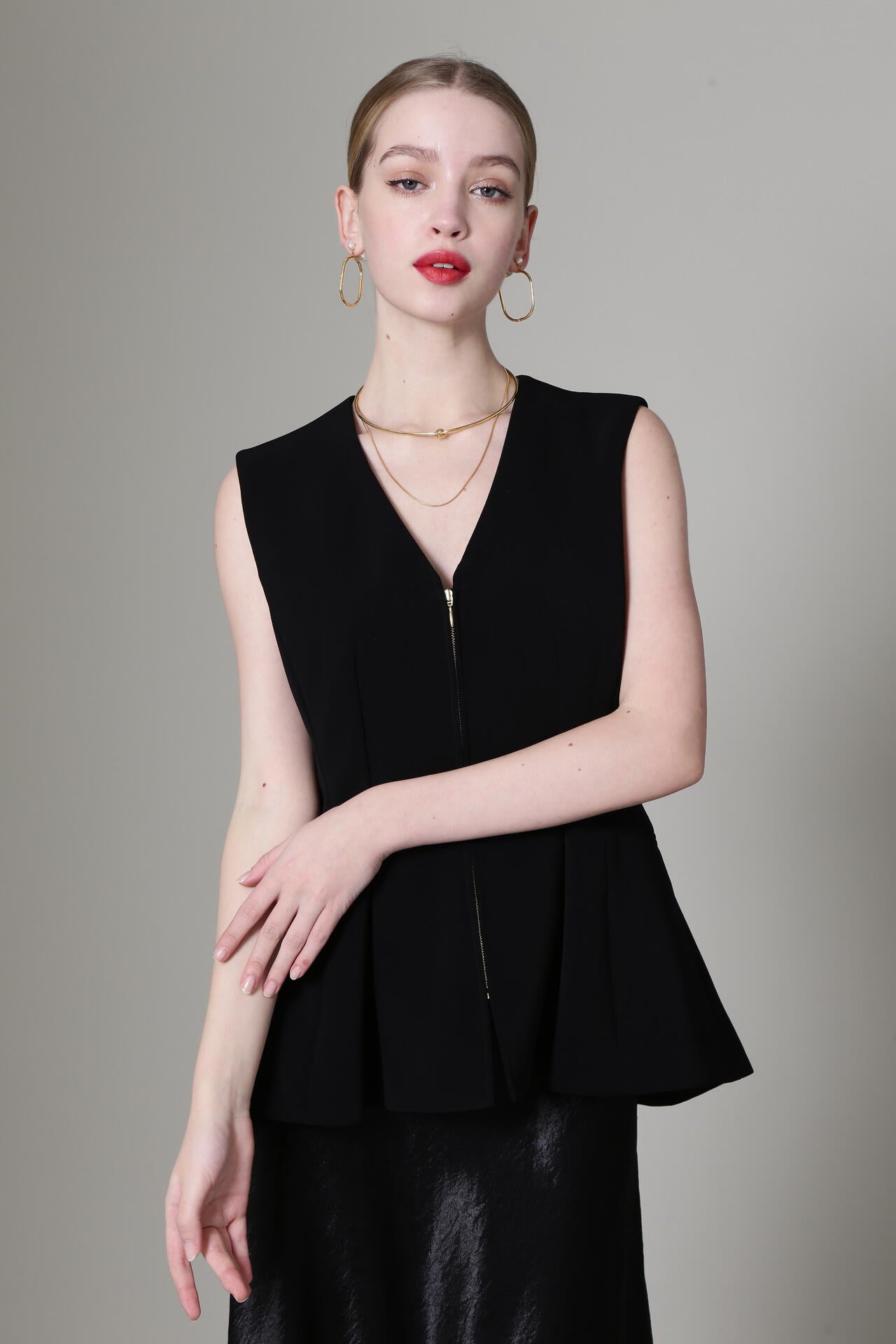 ウエストからふんわりと広がるシルエットが華やかで印象的なジレは、襟ぐりのVカットがスッキリとした印象を与え、ゴールドのジップが華やかなアクセントを添えています。デニムに合わせたカジュアルなスタイリングから、同素材のスカートと組み合わせた綺麗めなコーディネートまで、幅広く活用できるアイテムです。