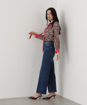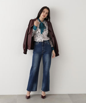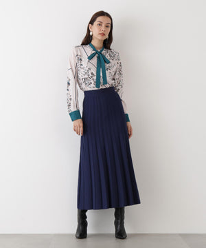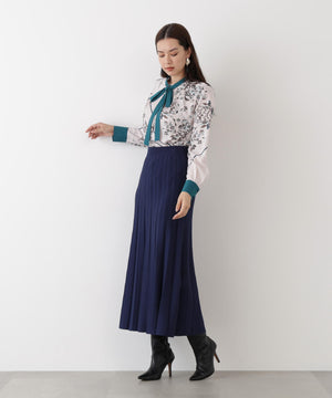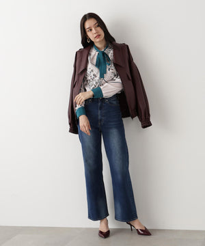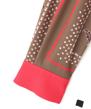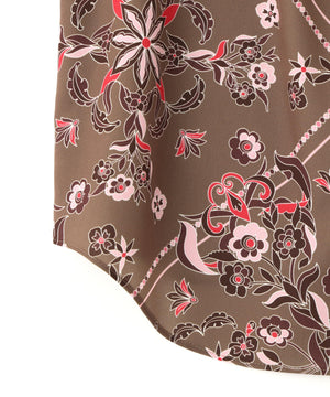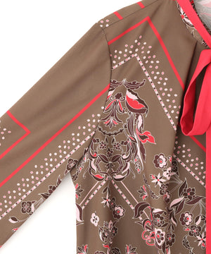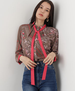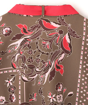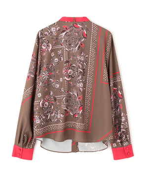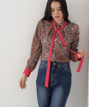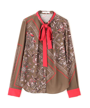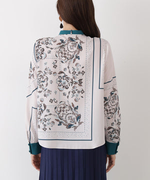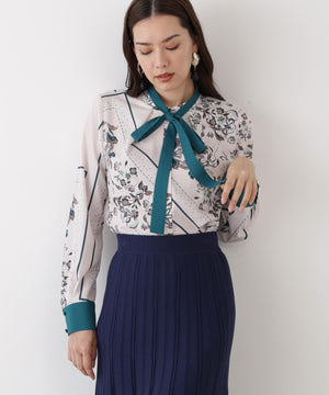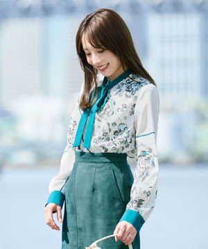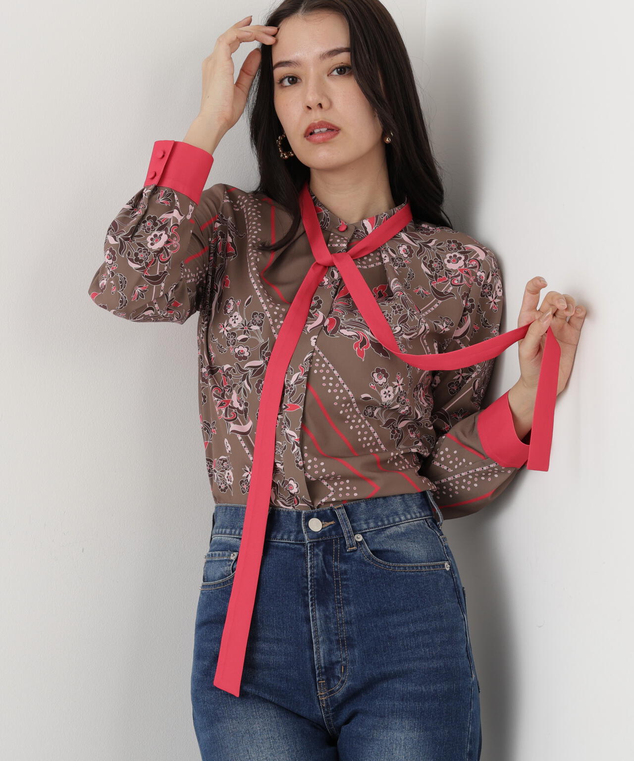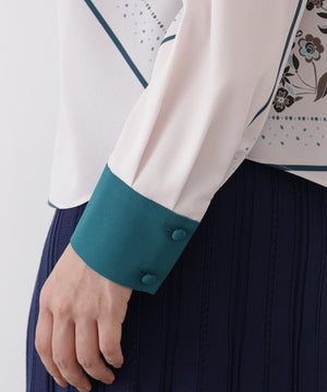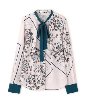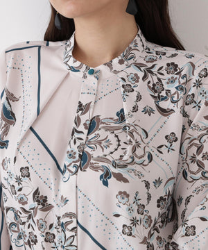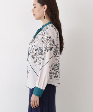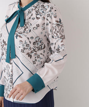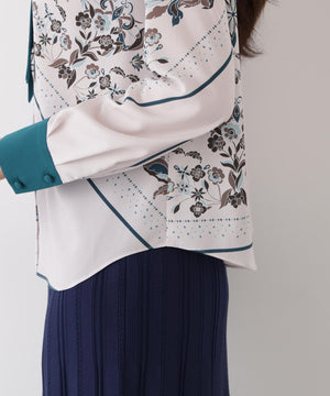 クラシカルなフローラルスカーフ柄が目を惹く、エレガントなブラウス。スタンドカラーがきちんと感を演出し、襟元から流れるタックドレープが顔まわりを華やかに彩ります。襟のリボンと袖口カフスにはカラー切り替えを施し、さりげないアクセントをプラス。シンプルなボトムスと合わせるだけで、コーディネート全体をクラシカルで上品な印象に仕上げてくれる主役級の一着です。