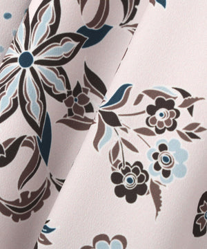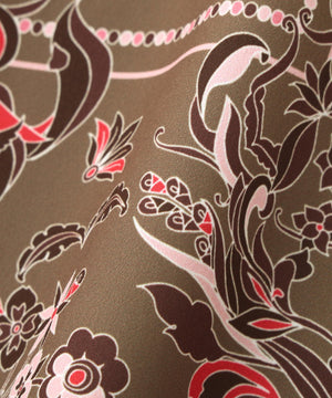 ソフトなドレープ性と軽やかな風合いが特徴で、上品な光沢感がクラシカルな印象を引き立てるアンティークデシンを下地に、抽象的な模様やフローラル、幾何学的なパターンを組み合わせたスカーフ柄をプリントしました。