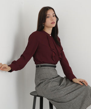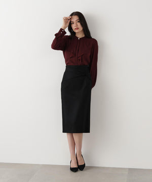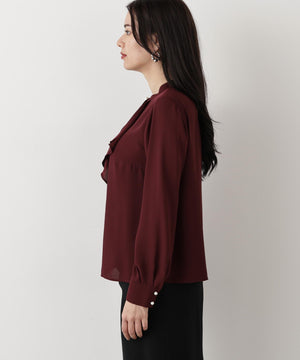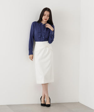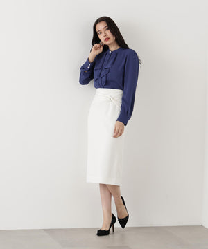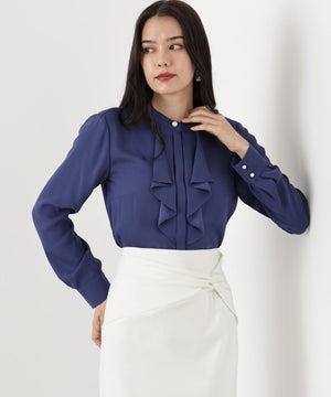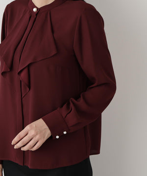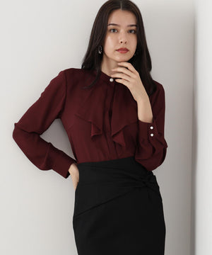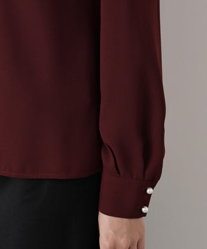 フロントの大きめな一粒パール調ボタンが顔を明るくみせてくれます。タイトスカートと相性の良い華やかなブラウスです。