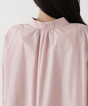 ネックラインや前立てに入ったタックドレープが豊かな表情を生み、スタンドカラーからつながるボウリボンがフロントを華やかに彩ります。
