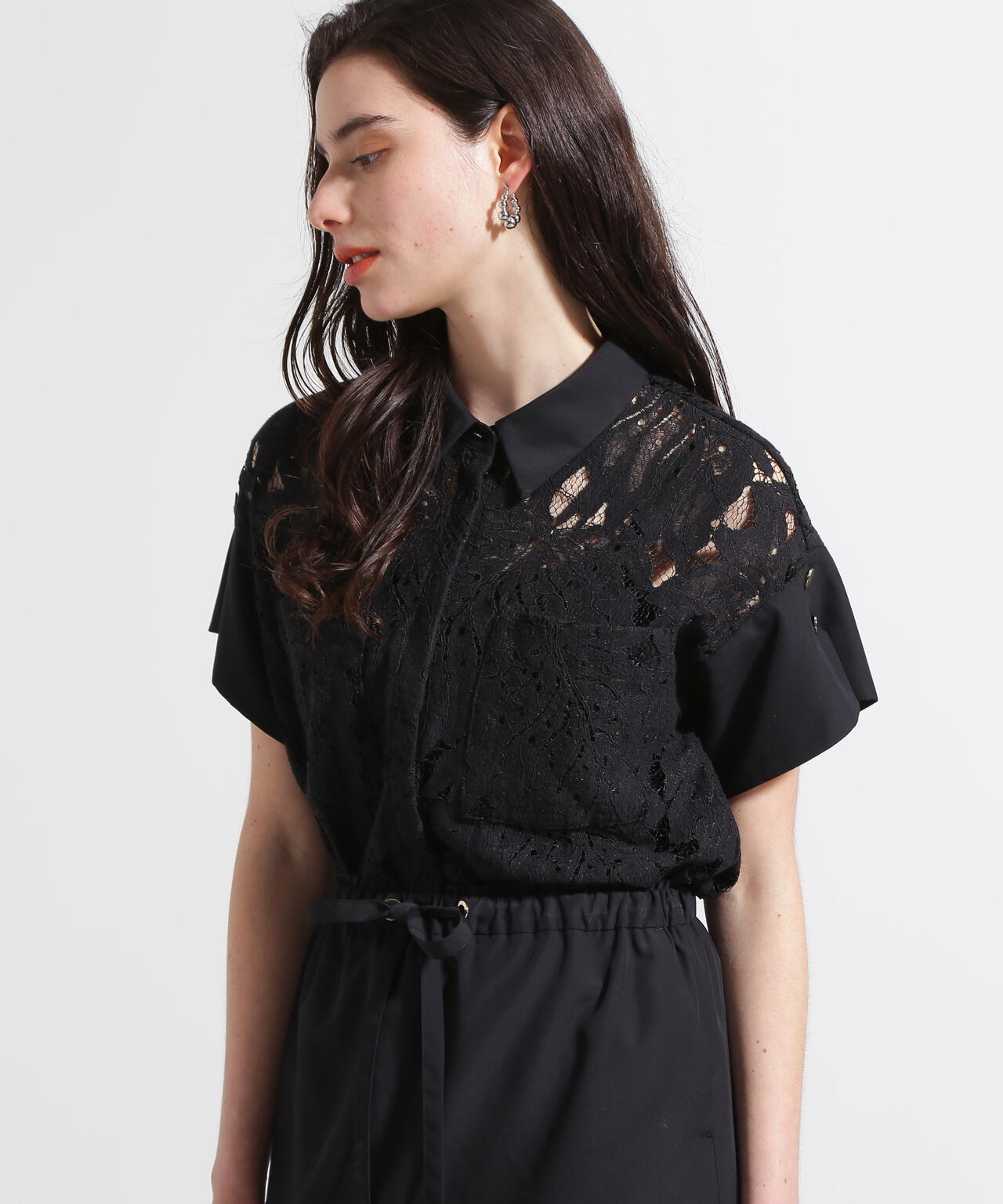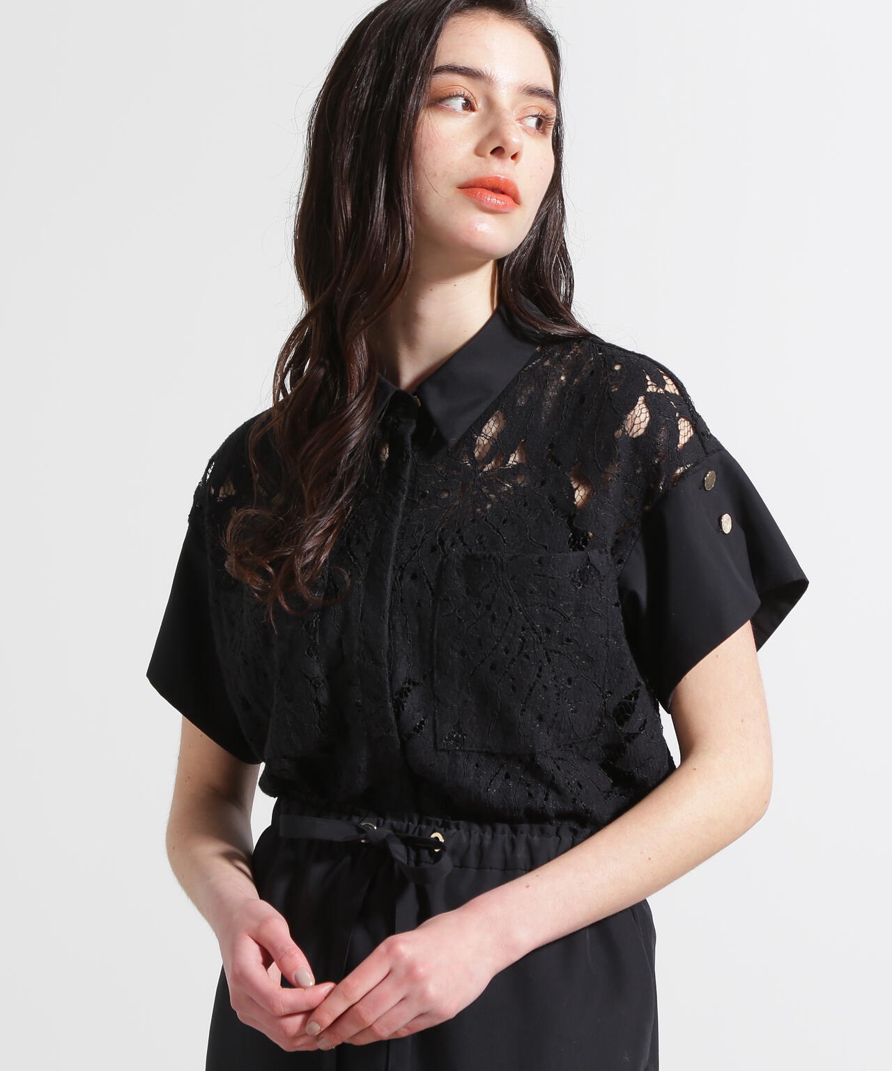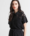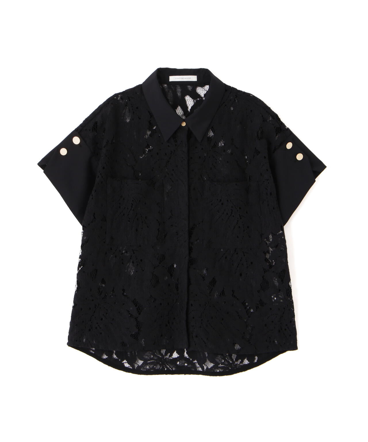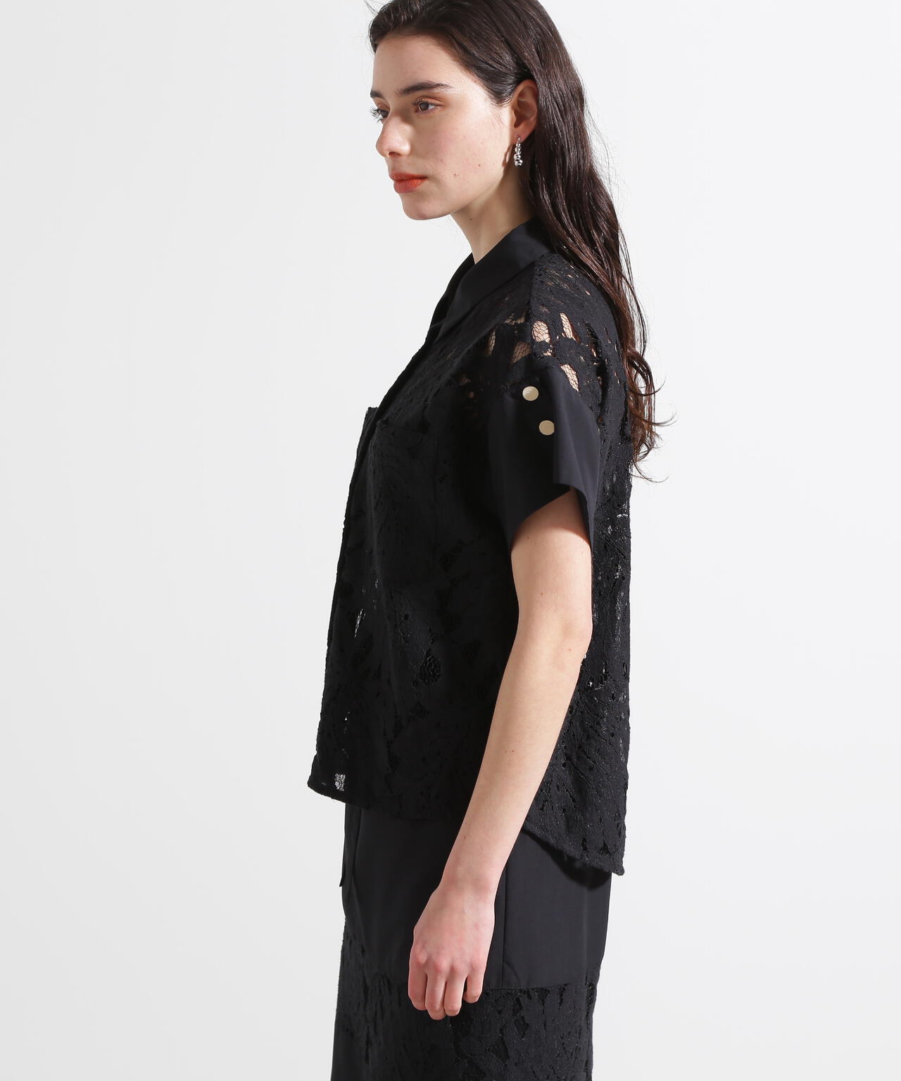 リーフ柄のレースが涼しげな印象のブラウス。シャツカラーがきちんと感を演出しつつ、半袖デザインで軽やかさをプラス。カフスデザインやメタルアクセントがさりげない華やかさを添えます。1枚でも涼しげでおしゃれな着こなしが叶い、同素材のスカートとセットアップで着用すれば、さらに洗練されたスタイルを楽しめる一着です。
