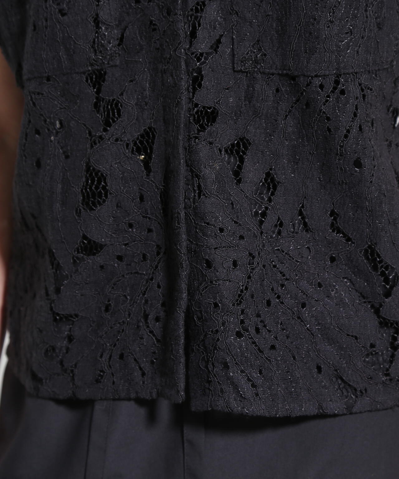 希少価値の高い編機を使用し編み上げた大きなピッチのリーフ柄レース素材。ヘビーなウェイトに見えながら軽さか特徴の素材。無地部分にはきれいな表情を持ちつつスパン糸を使用することでリラックス感もある素材を使用。速乾性もありつつシワになりにくいのも特徴。