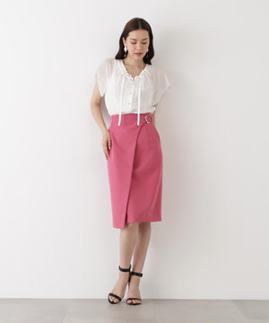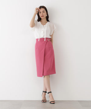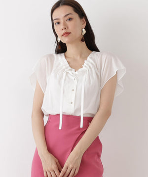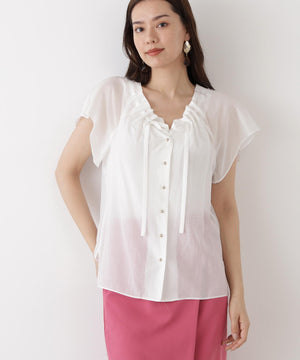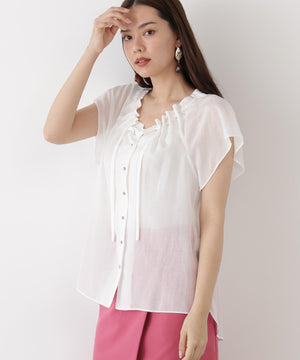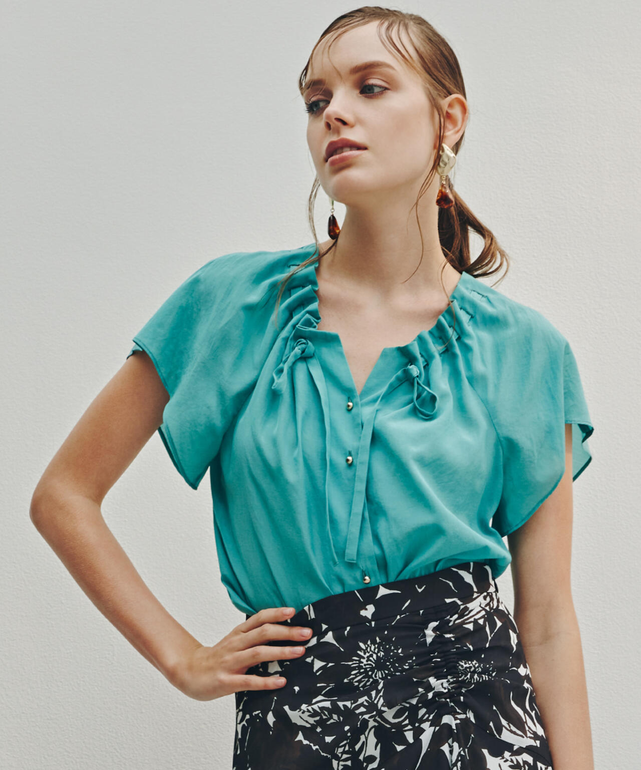 微光沢が上品なローン素材の薄手ブラウス。ネックに共布の紐を通してギャザーを作り、軽く華やかな印象をもたせています。シアー感のある涼し気な素材に、小ぶりのゴールドのボタンが上品なアクセント。裾はスリット入りでパンツにハーフインした着こなしも素敵です。