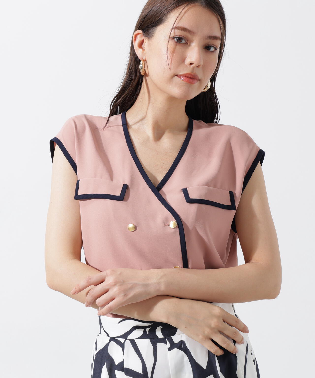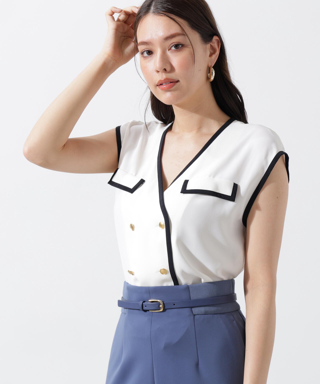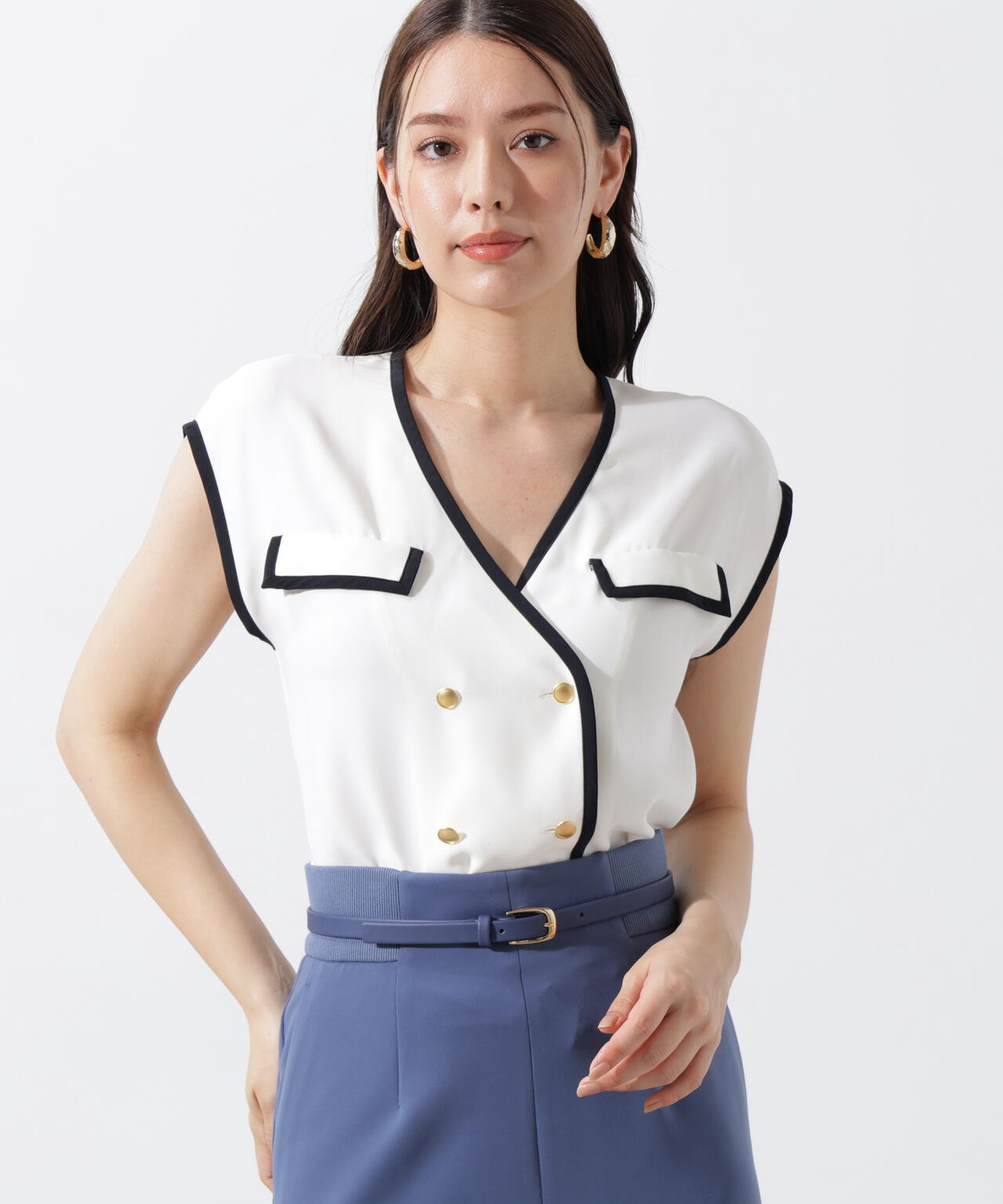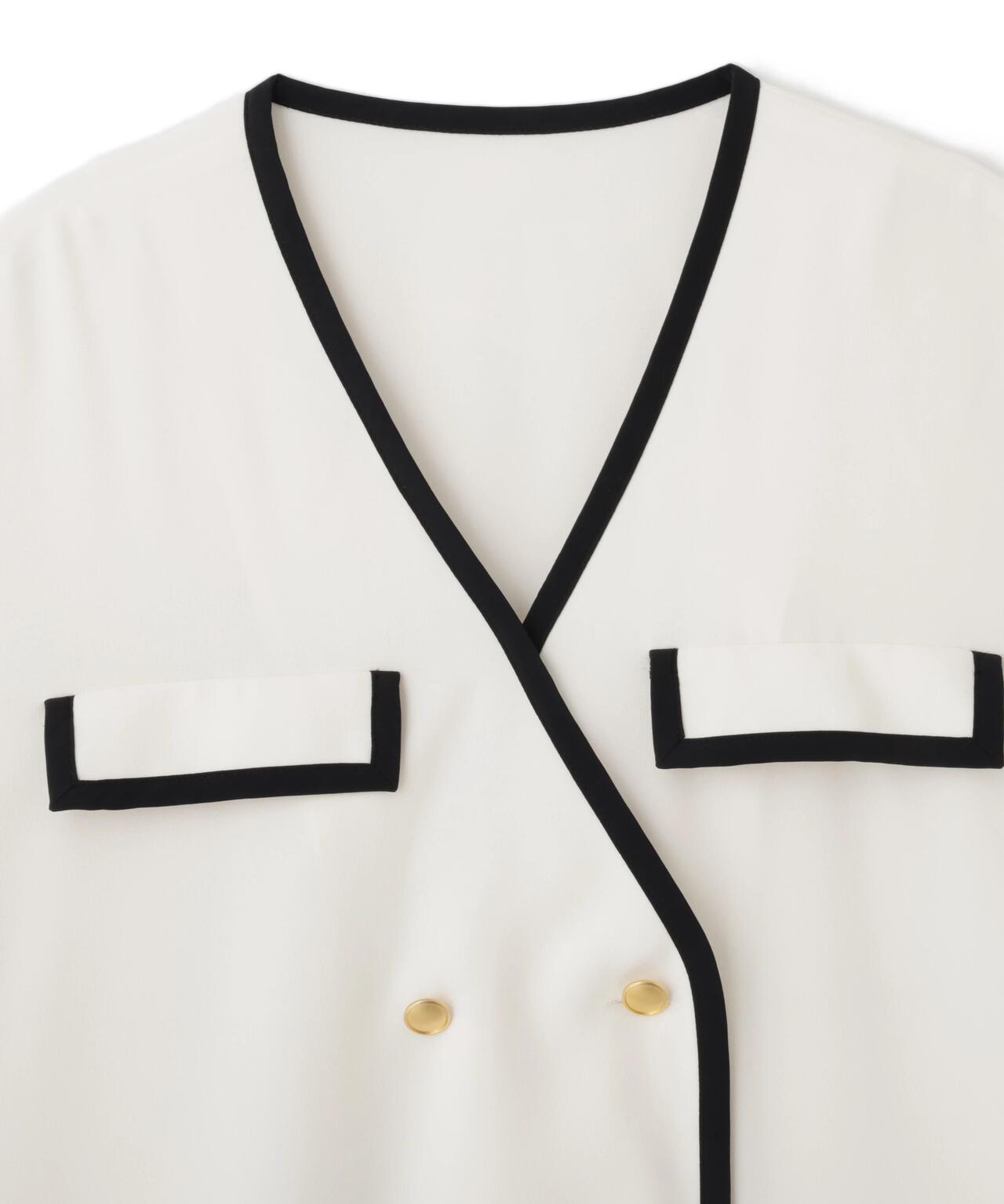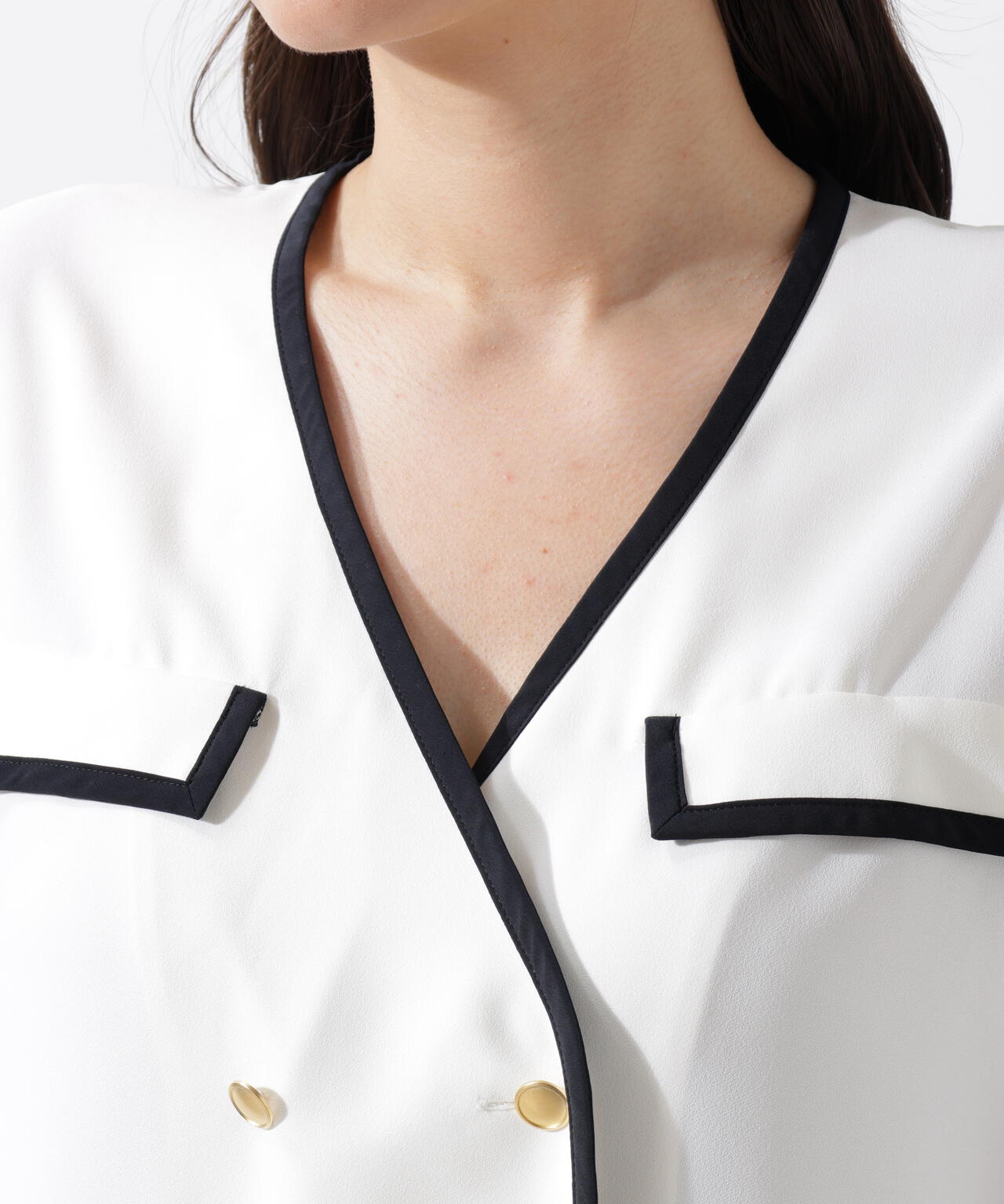 フロントのダブルの打ち合わせとメタルボタンがアクセントになったデザインで、バイカラーのバインダーディテールが、スタイリングにシャープな印象をプラス。