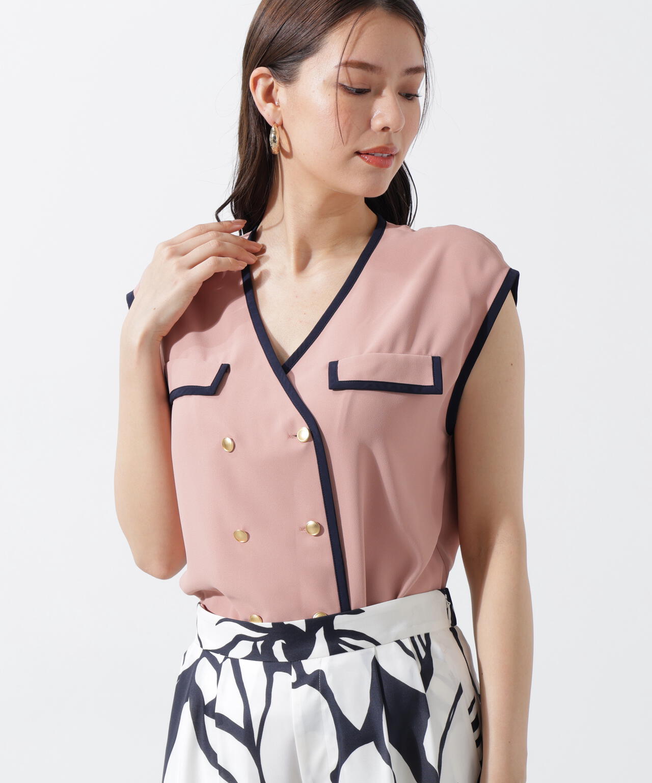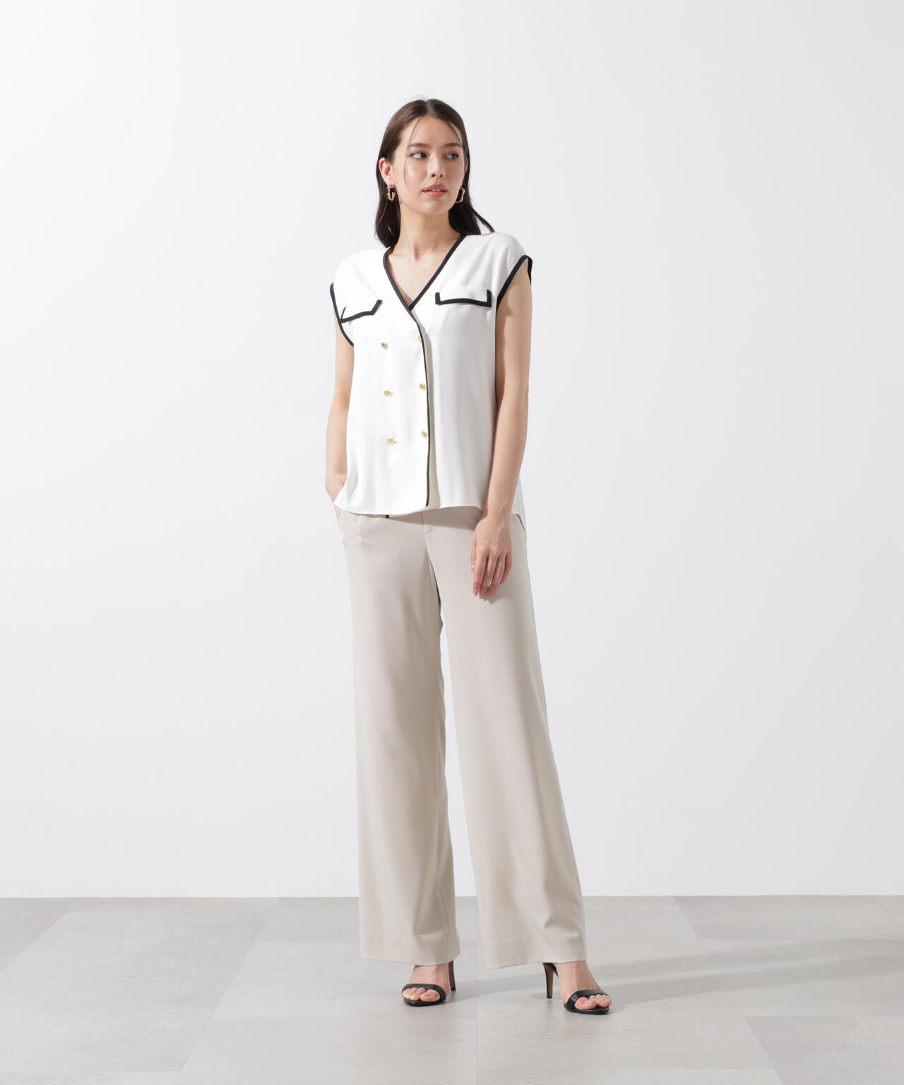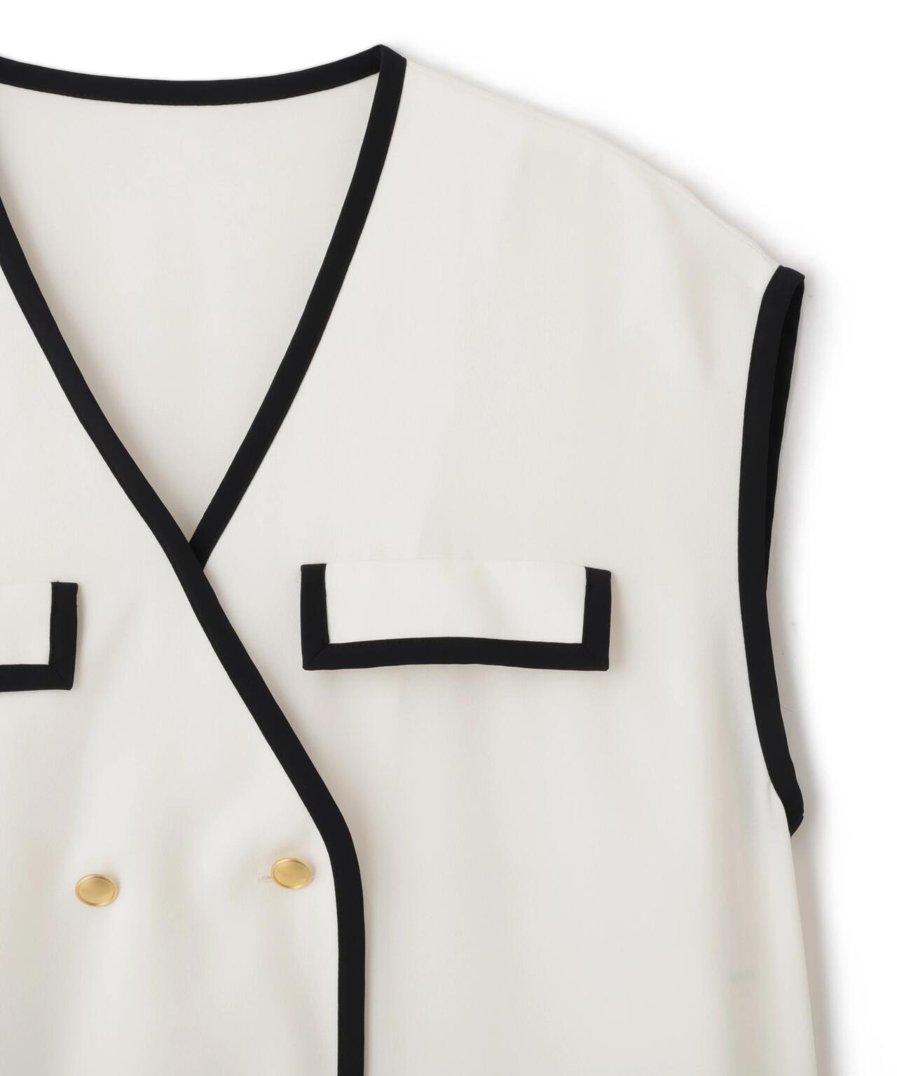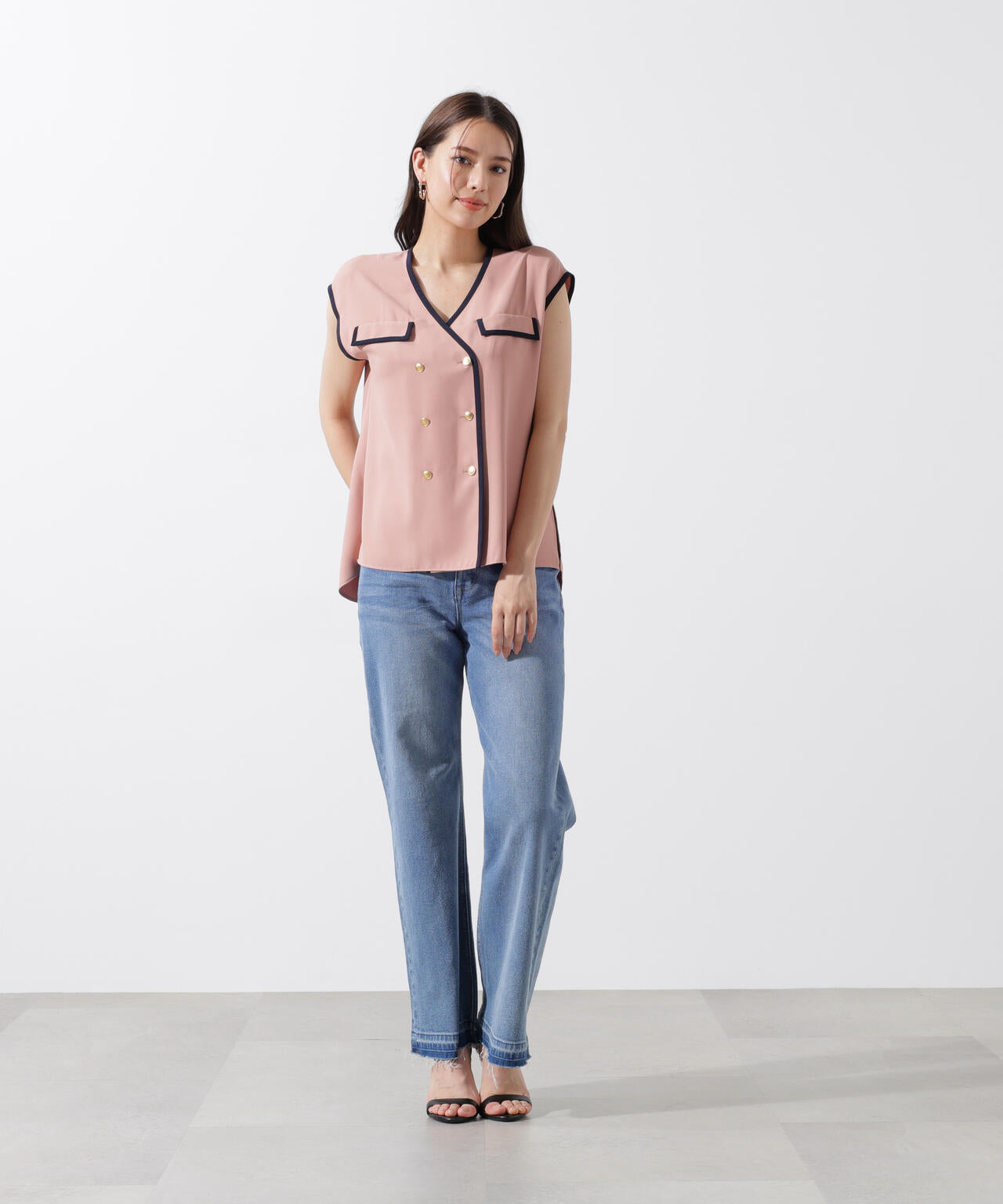 フロントのダブルの打ち合わせとメタルボタンがアクセントになったデザインで、バイカラーのバインダーディテールが、スタイリングにシャープな印象をプラス。