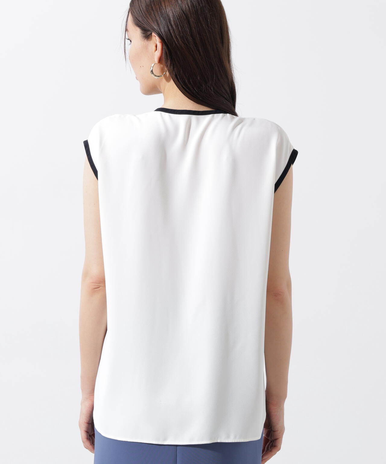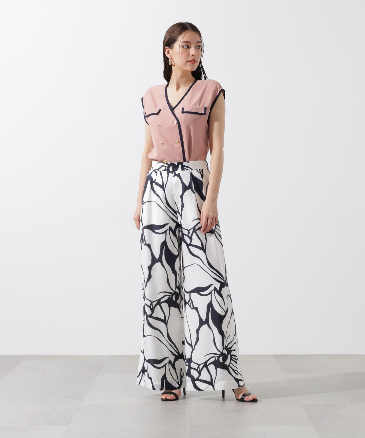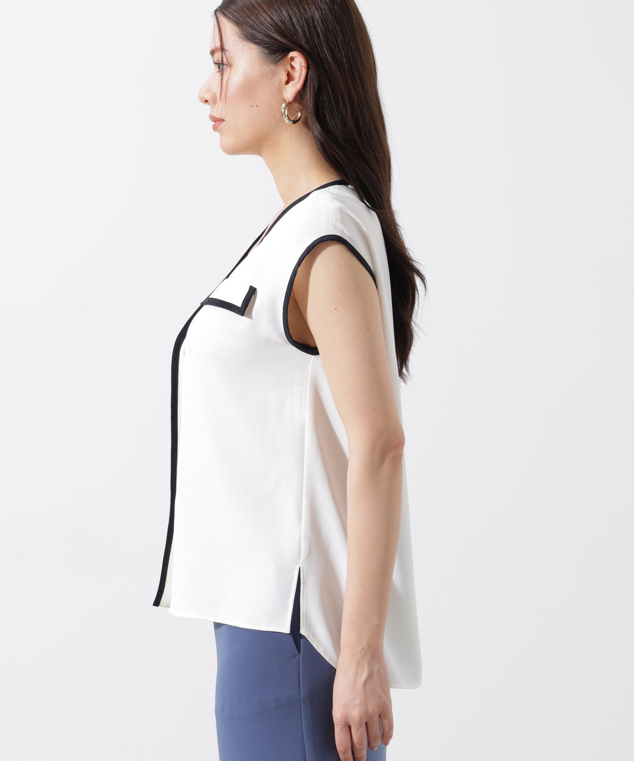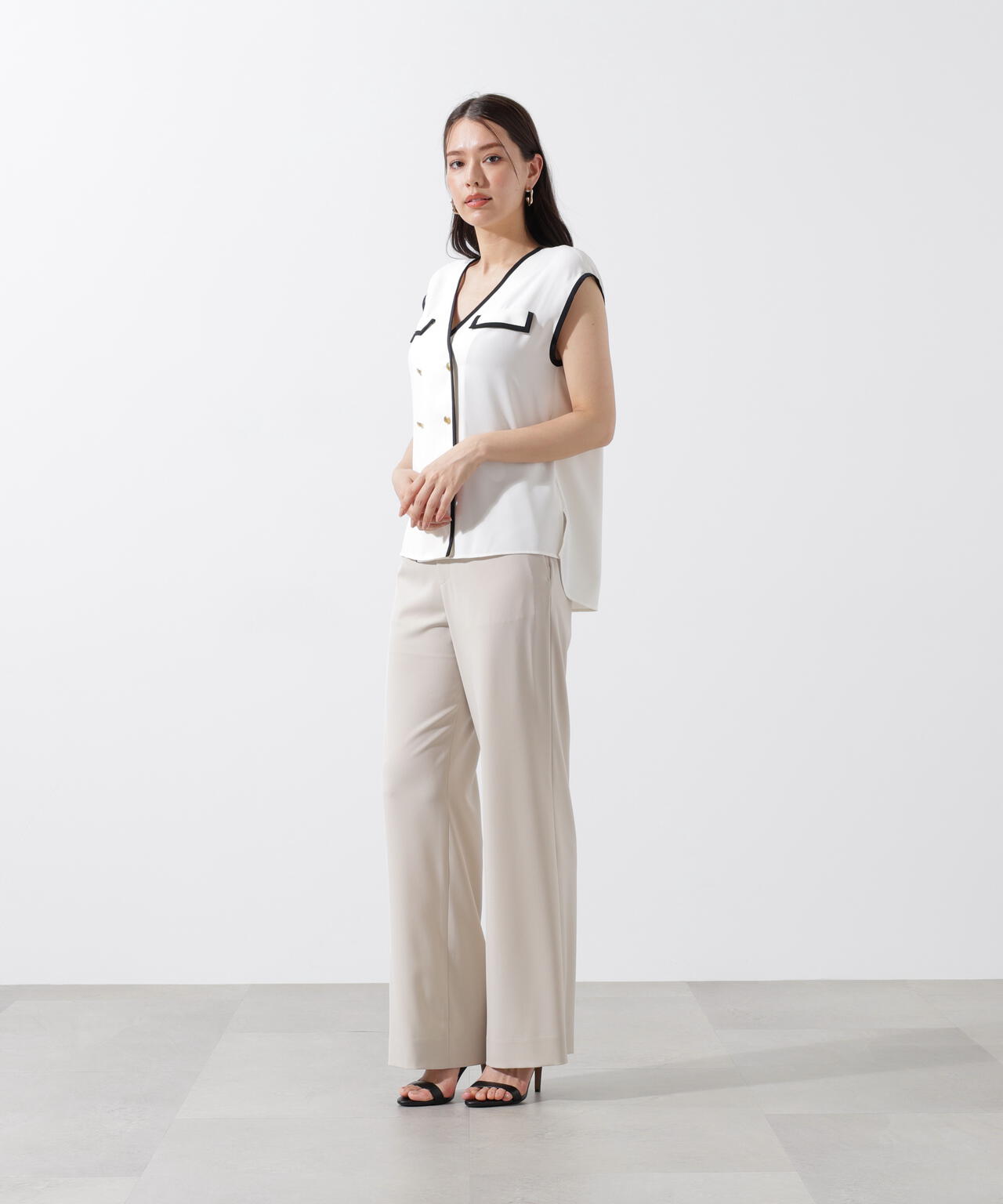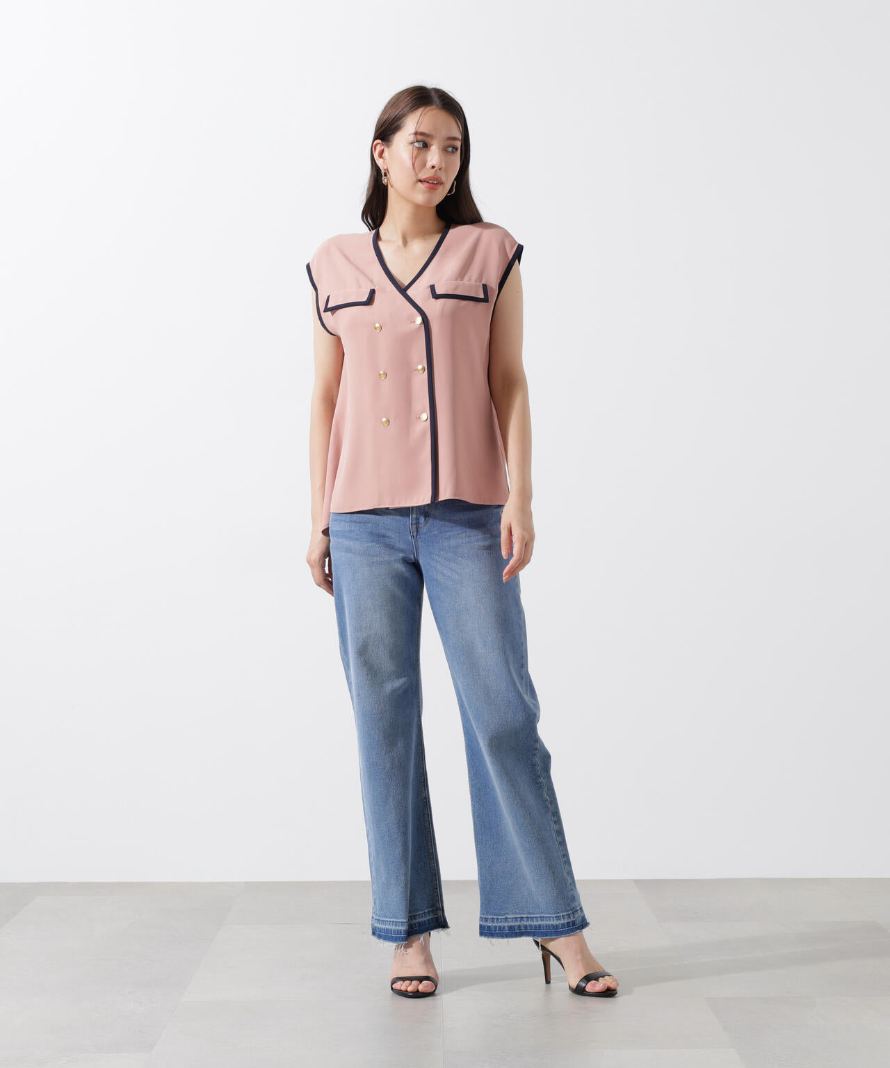 フロントのダブルの打ち合わせとメタルボタンがアクセントになったデザインで、バイカラーのバインダーディテールが、スタイリングにシャープな印象をプラス。