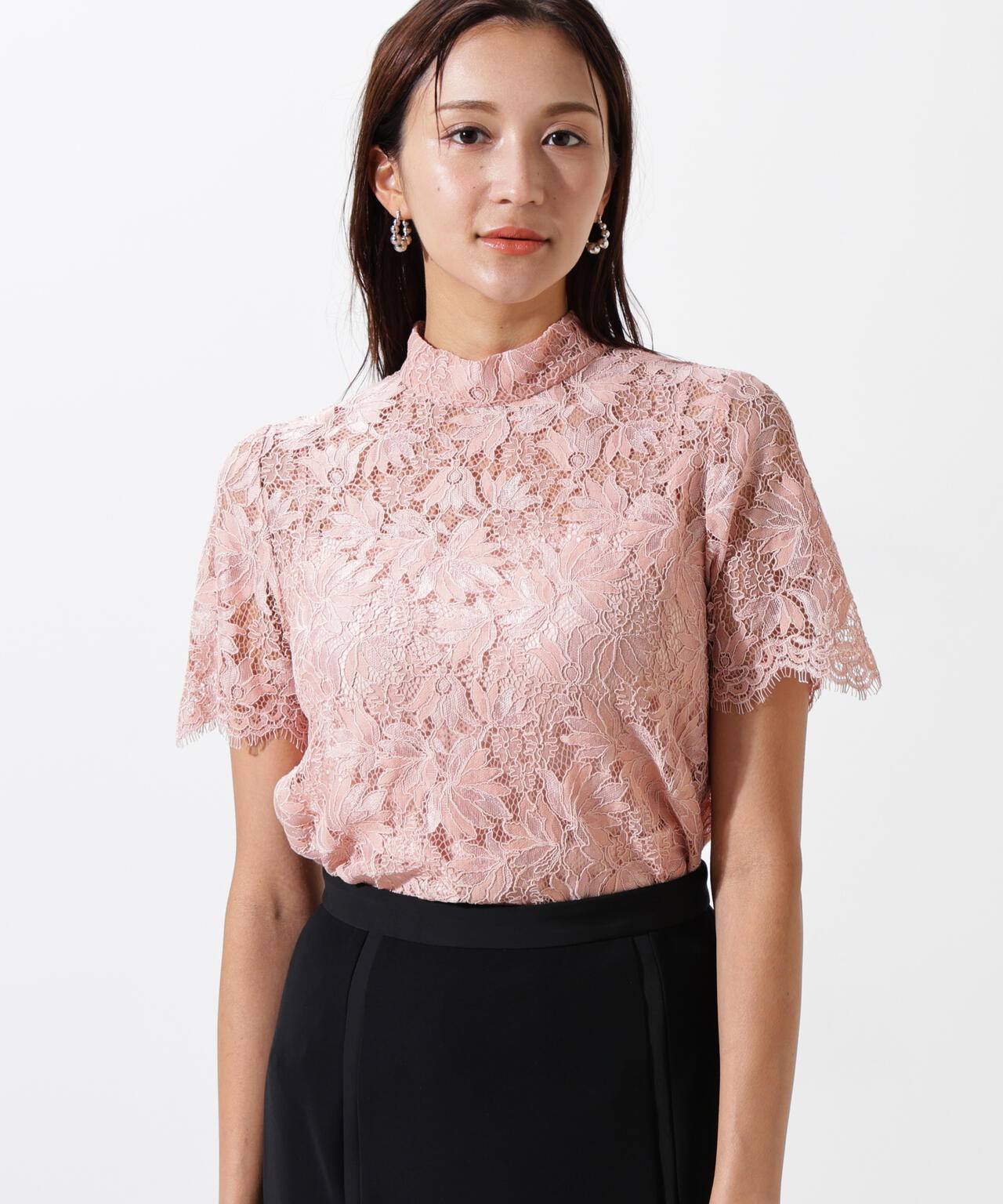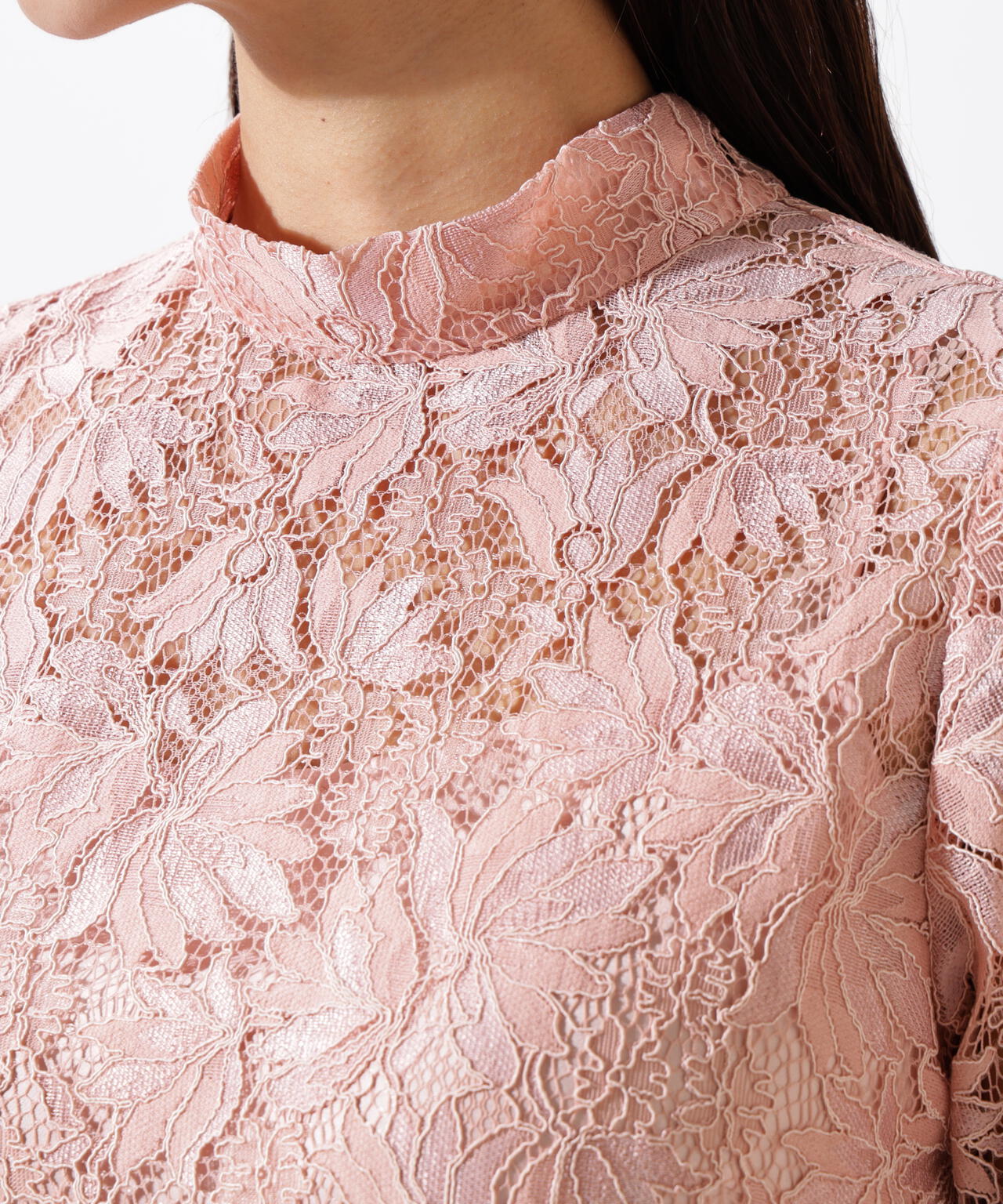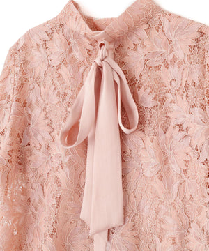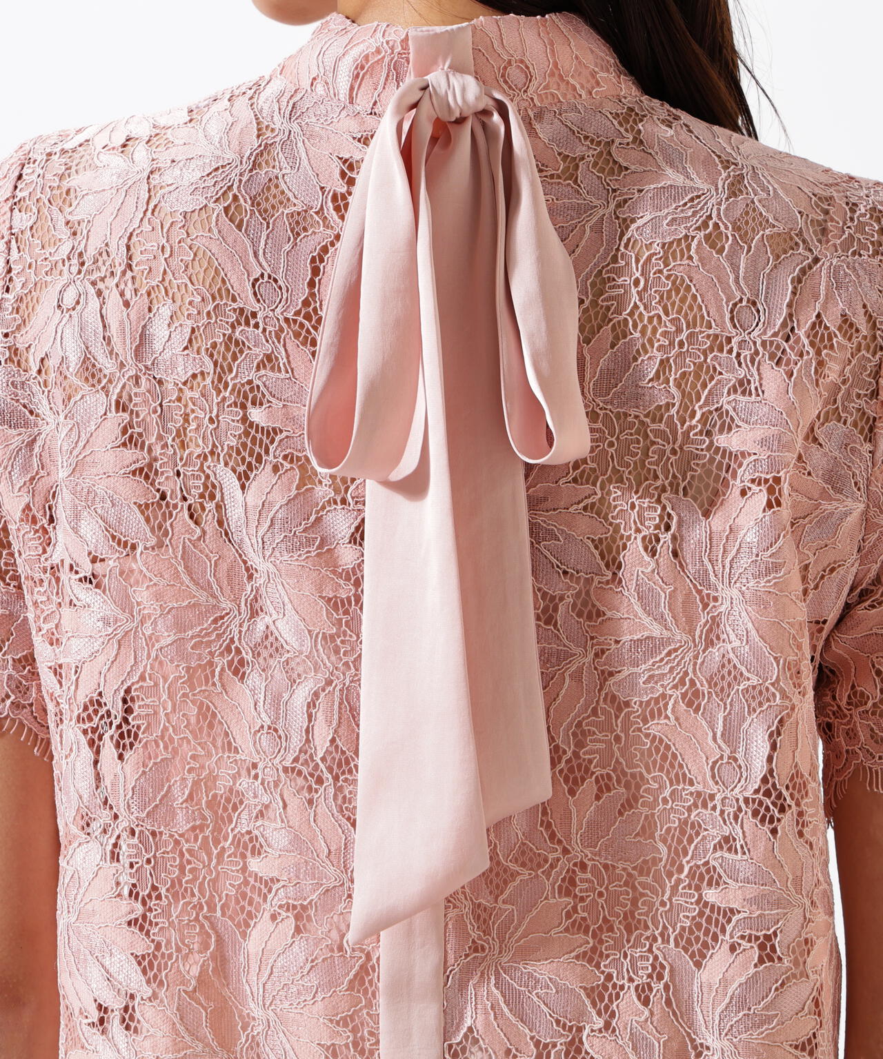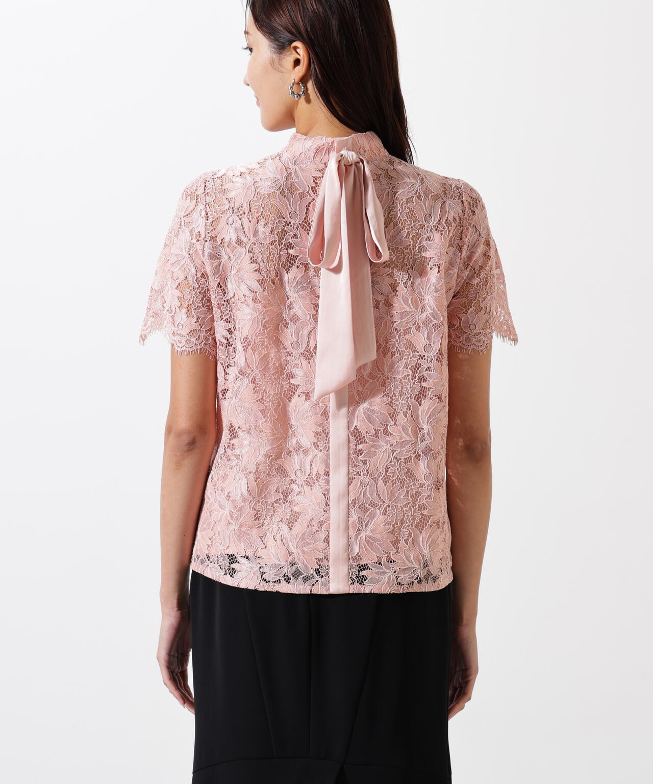 スタンドカラーで上品な雰囲気の総レースブラウス。繊細で華やかさのあるレースで仕立てられたスタンドカラーレースブラウス。見頃の裏にシフォンを重ねることで上品な透け感を作りあげています。デコルテから袖にかけての透け感が大人っぽい印象を与えます。後ろは同色のサテンリボンと前立てがポイントで、バックスタイルまで抜かりなく、どの角度からも目を惹きます。