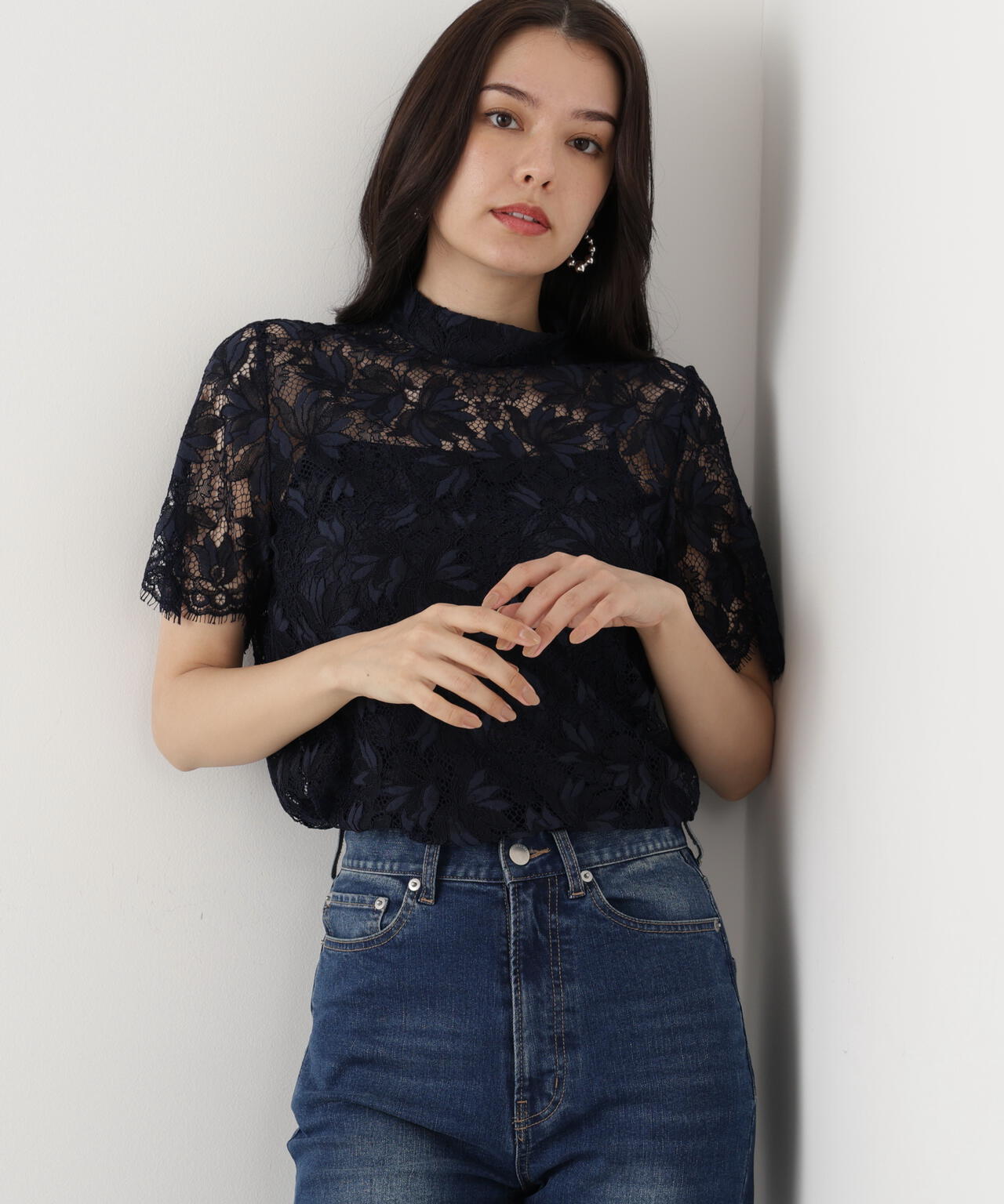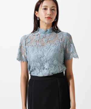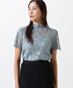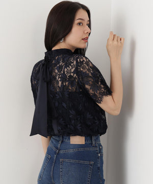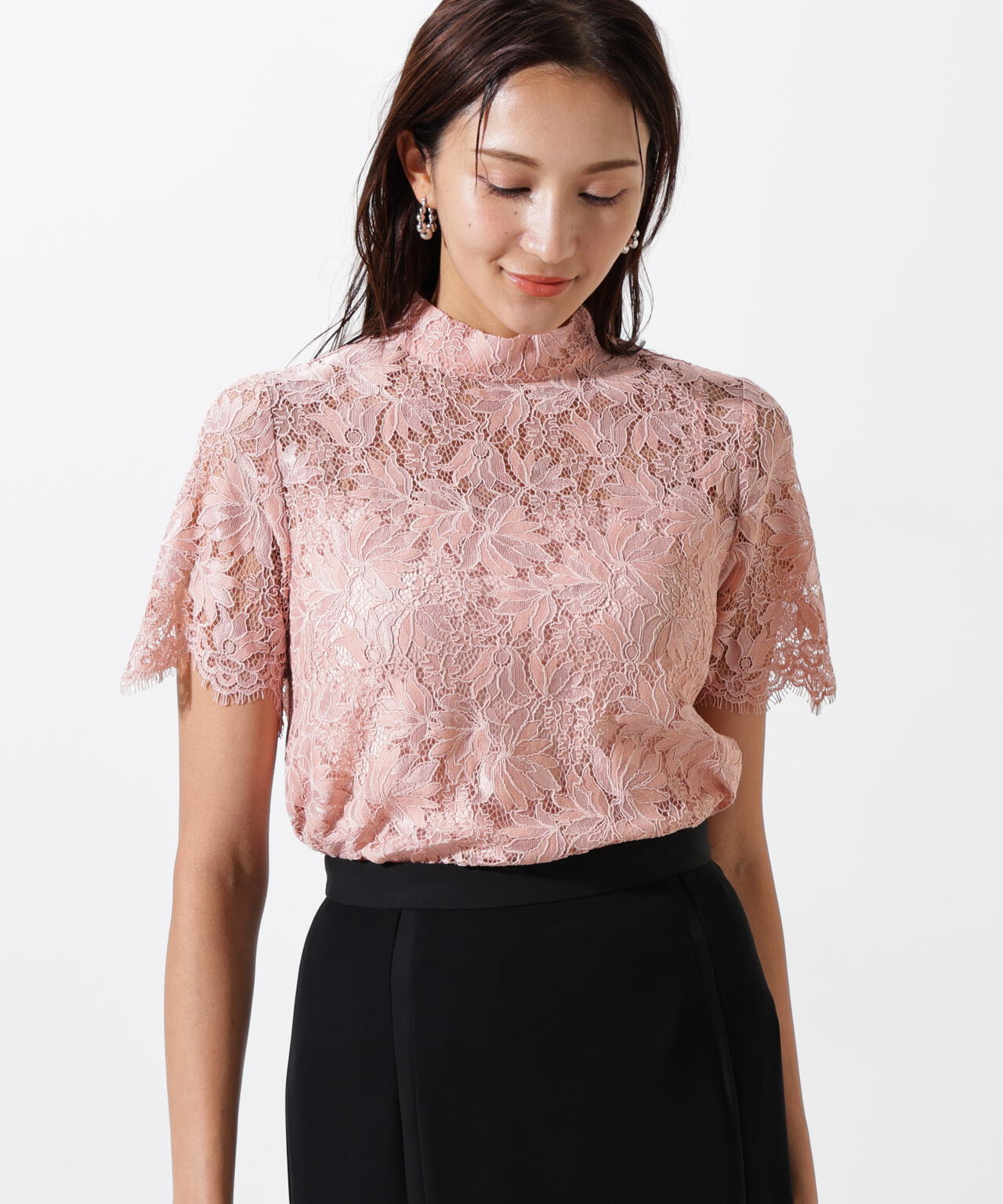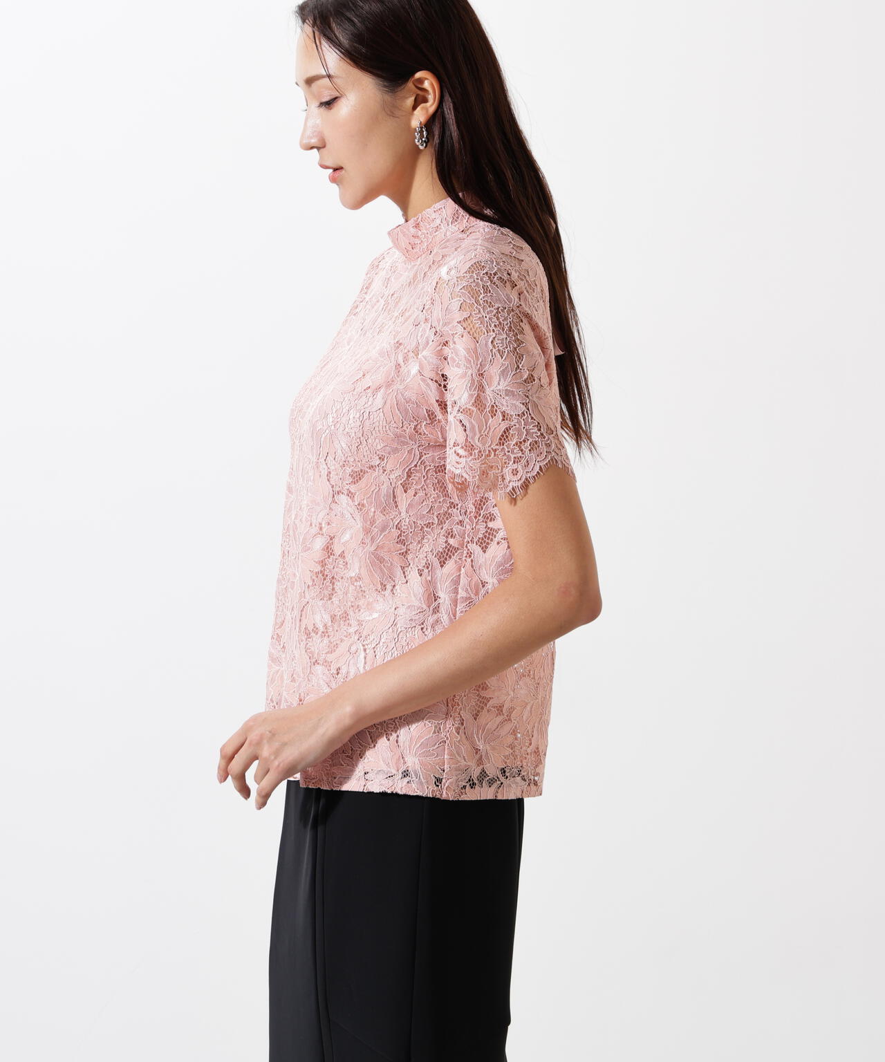 スタンドカラーで上品な雰囲気の総レースブラウス。繊細で華やかさのあるレースで仕立てられたスタンドカラーレースブラウス。見頃の裏にシフォンを重ねることで上品な透け感を作りあげています。デコルテから袖にかけての透け感が大人っぽい印象を与えます。後ろは同色のサテンリボンと前立てがポイントで、バックスタイルまで抜かりなく、どの角度からも目を惹きます。