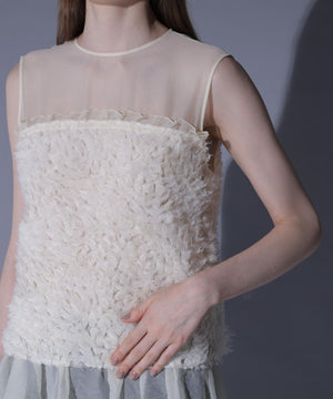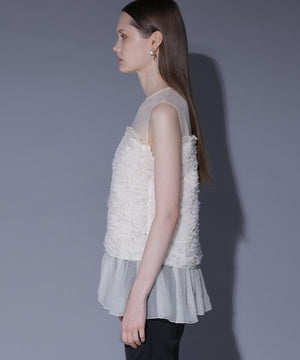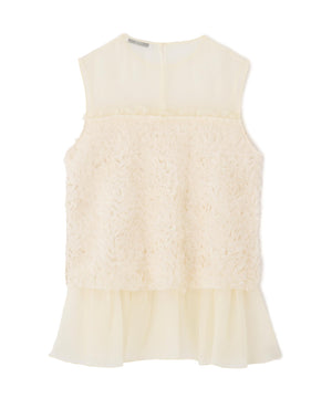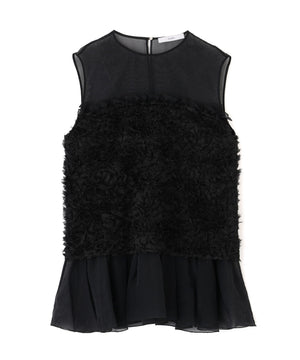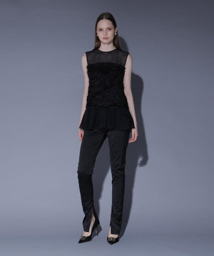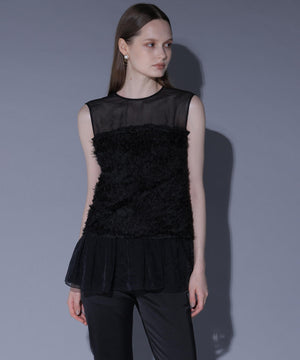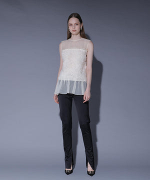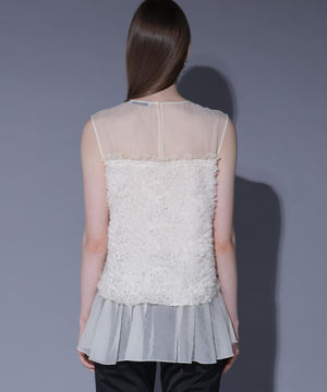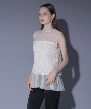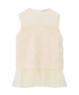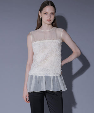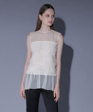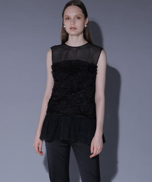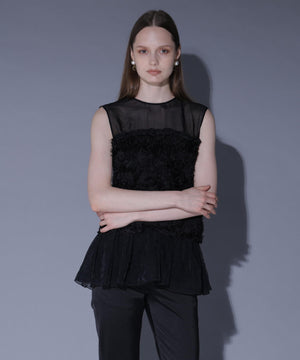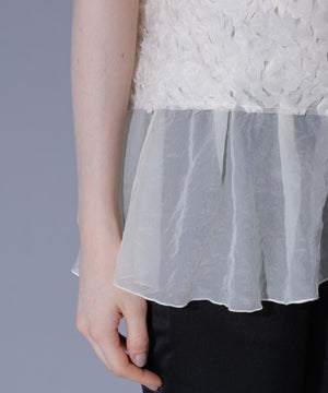 チュールとオーガンジー、2つのシアー素材を組み合わせた、立体感と華やかさが際立つコンビブラウス。身頃にはチュールに立体的な刺繍を施した華やかな素材を使用し、胸上とペプラム部分には繊細な透け感が美しいオーガンジーをあしらいました。デコルテを上品に引き立てるシアーな質感と、タックフレアで描くペプラムの美しいラインが、フェミニンな魅力を一層引き立てます。シンプルなボトムと合わせるだけで、華やかなドレスアップスタイルが完成する一着です。