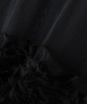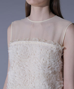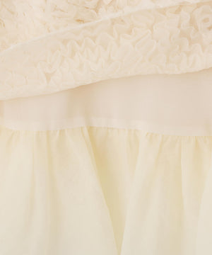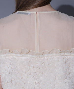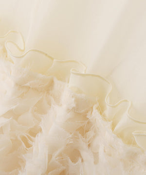 身頃には、イタリア・CAFISSI社(カフィーシー)のチュール刺繍素材を使用。ネットチュールをベースに、繊細なチュールテープを丁寧に刺繍し、立体感と華やかさを演出しています。軽やかで上品な存在感を放つ、特別感のある素材です。胸上とペプラム部分には、繊細なオーガンジー素材を使用。キュプラ混ならではの柔らかさと微光沢が特徴で、軽やかさとしなやかなハリ感を兼ね備えた、上品な風合いの素材です。