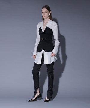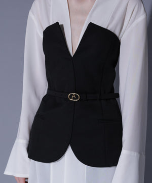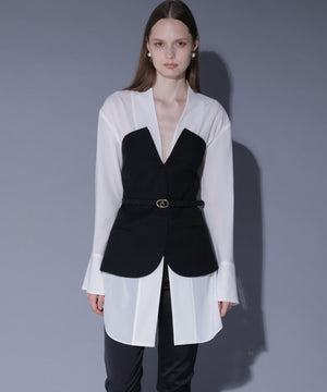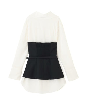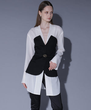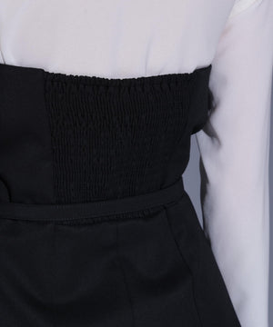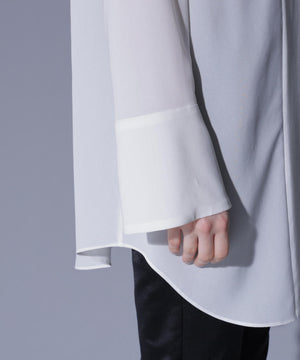 ブラウスにはアセテートオーガンジーを使用。ドライタッチですっきりとした表面感が特徴です。ベアトップには、ウール100%の上質素材に2WAYストレッチを加えた生地を使用。柔らかな風合いと快適な着心地です。