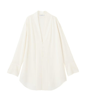繊細なシアー感と優美なドレープが魅力のトリアセテート混の上質素材を使用したロングブラウスと、上品な光沢を湛えるウール素材のベアトップをレイヤードしたセットアイテム。インナーのブラウスは、身体を包み込むようなゆったりとしたシルエットのガウンのように羽織れる贅沢な一枚。シャープなラインを描くヘムカットが、ラグジュアリーの中にも芯のある佇まいを演出します。胸元に美しいカッティングを施したベアトップは、ブランドロゴをあしらったメタルバックルベルトがアイコニックなアクセントに。ドレスアップスタイルとしてのセット着用はもちろん、それぞれを単品で着まわせば、洗練された表情を多彩に引き出すことができる、エフォートレスかつ華やかなアイテムです。