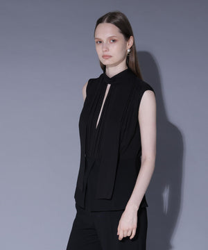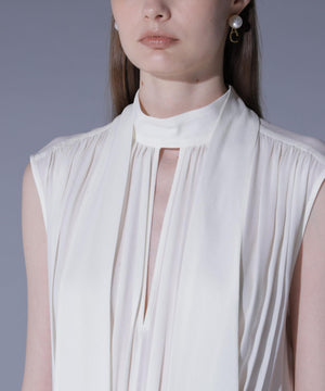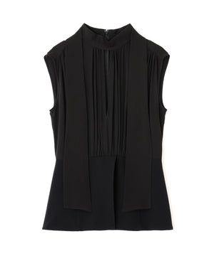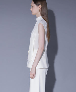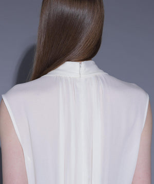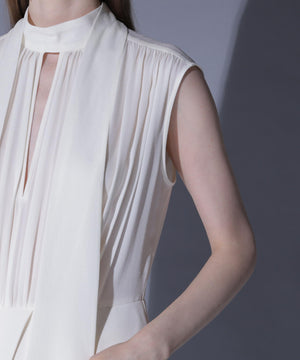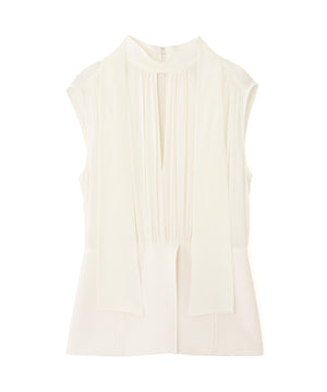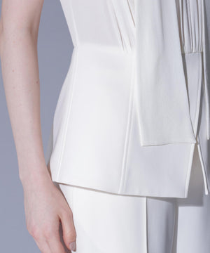 上質なシルクジョーゼットとトリアセテートのダブルクロスを組み合わせた、コンビネーションブラウス。トップス部分には繊細なシルクジョーゼットを使用し、スタンドネックから流れるようなタックドレープとボウリボンが、華やかなでフェミニンな印象を演出します。ウエストからは程よくハリのあるダブルクロス素材に切り替え、すっきりとしたペプラムシルエットに。フロント裾のシャープなカッティングが、全体のスタイリングを引き締め、洗練されたバランスに仕上げています。同素材のダブルクロスワイドパンツと合わせた、セットアップスタイルもおすすめです。