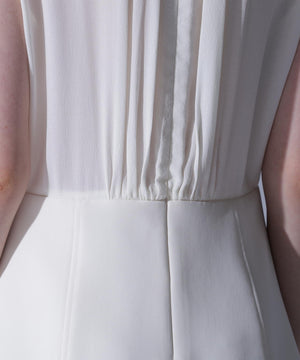 上身頃には程よい厚みと上品な透け感を兼ね備えた16匁シルク梨地ジョーゼットを使用。シルクならではのなめらかな肌触りと、梨地特有の繊細なシボ感が特徴で、軽やかさとエレガントなドレープ性を併せ持つ素材です。ペプラム部分には、トリアセテートとポリエステルの合繊糸を使用した平二重織素材を採用。とろみのあるしなやかな風合いが、すっきりとした美しいシルエットを引き立てます。