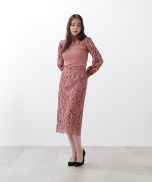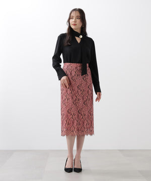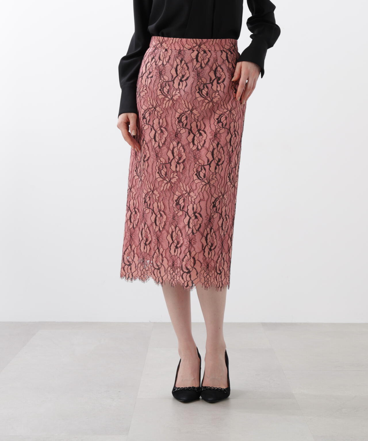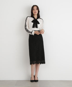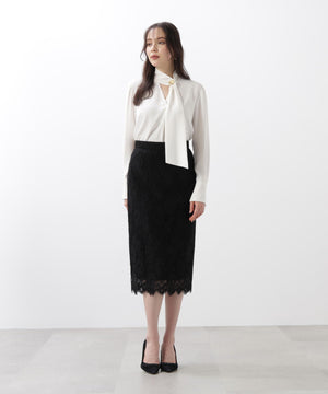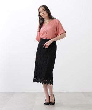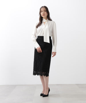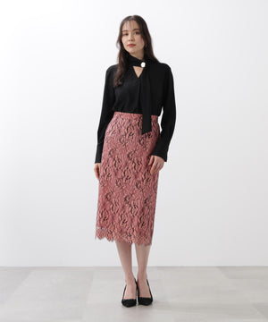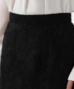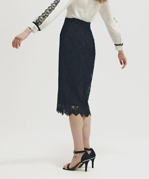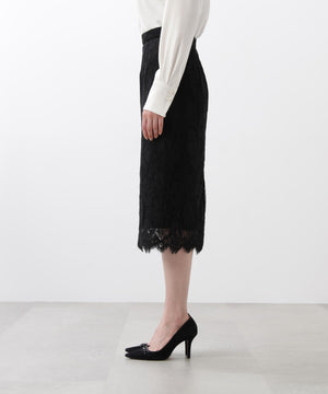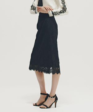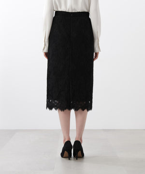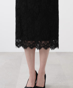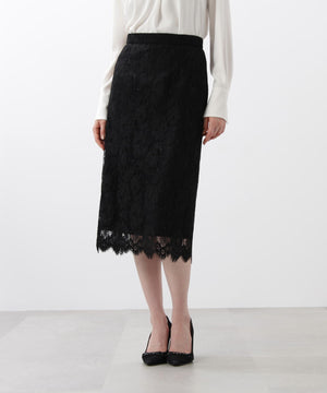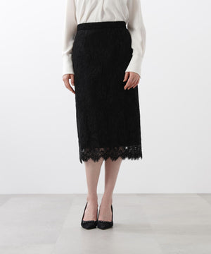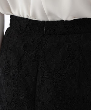 すっきりとしたIライン&ハイウエストで腰まわりをカバーしながら、キレイなレッグラインも叶えてくれます。裾はレースの雰囲気を活かした、透け感のあるスカラップディテールで、軽やかな足元を演出。キレイ目なブラウスや同素材レースコンビニットと合わせたスタイリングがおすすめです。