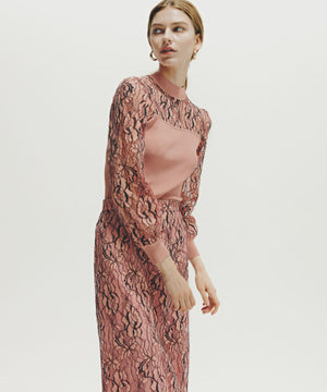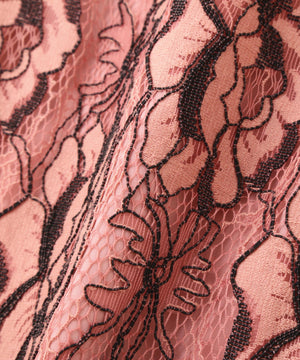 陰影のあるフラワーレースで、凹凸感が豊かな表情をもつレース素材。メッシュのシアー感が清涼感をあたえ、装飾的でありながらも、繊細で洗練された印象の素材です。
