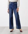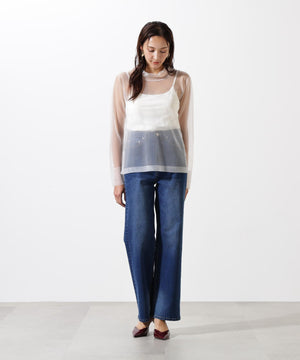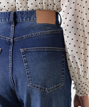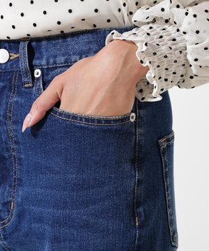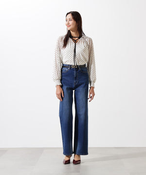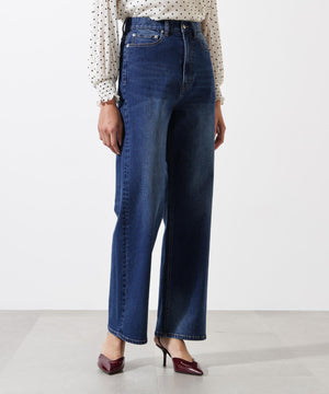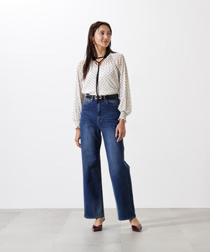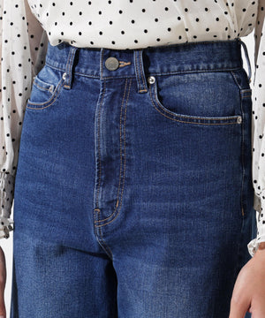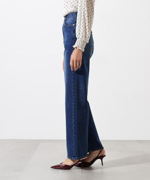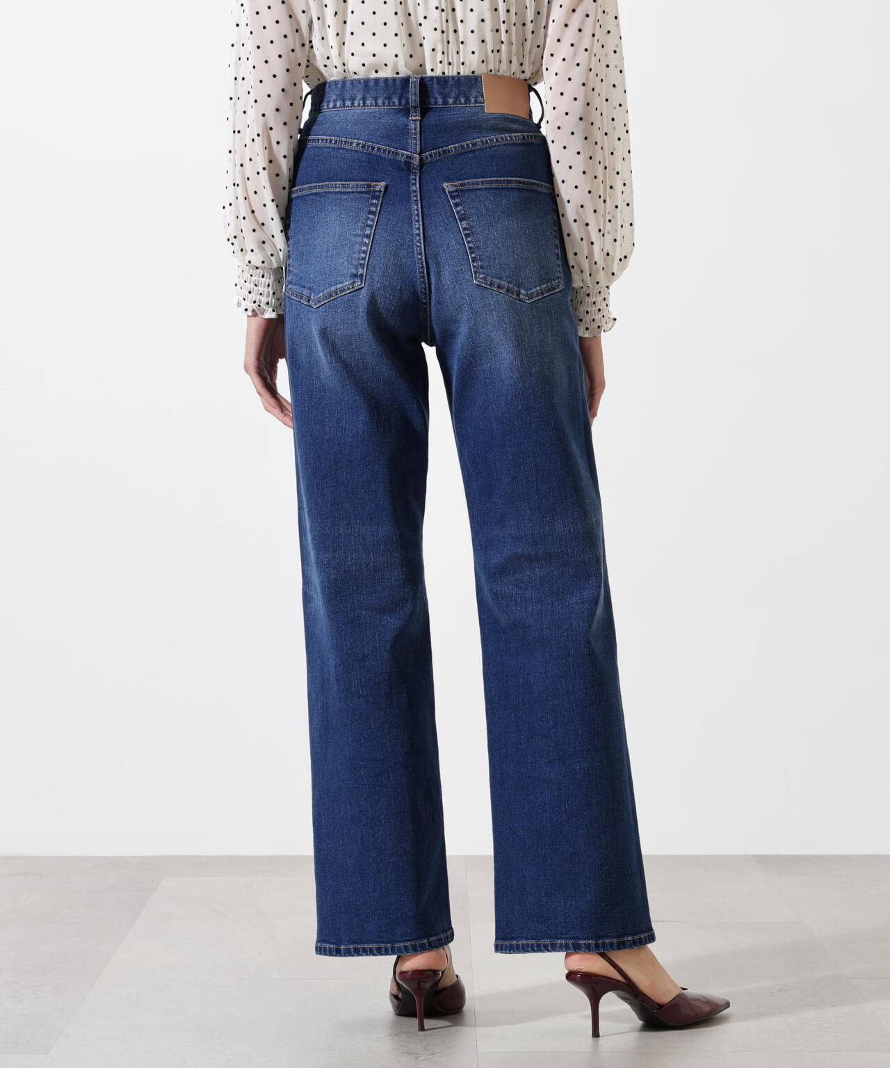 スラブ入りで上品なナチュラル感のあるデニムジーンズ。脚のラインが響きにくいワイドレッグで、腰回りはすっきりとフィット。脚の形を美しく、股下を長くみせてくれる、美脚効果の高い1本です。ヒールにもフラットシューズにも合わせやすく、カジュアル~きれいめまで様々なスタイリングを楽しめます。丁寧な加工によるヴィンテージの風合いや、後ろウエスト部分に縫い付けた合皮パッチなど、手の込んだディテールがひかる、大人の女性のためのワイドデニムです。