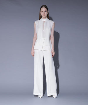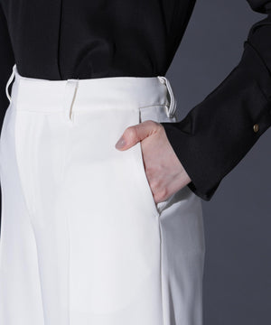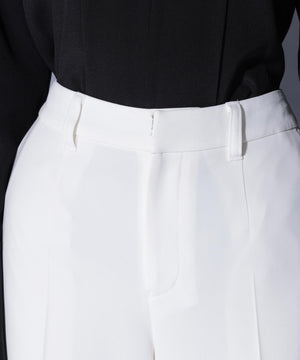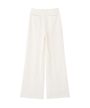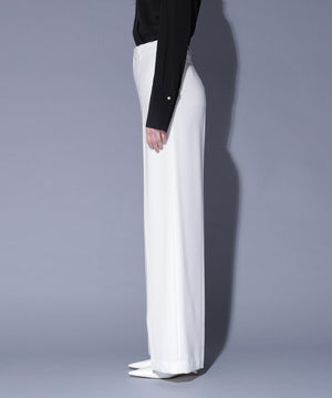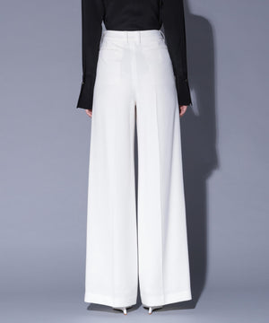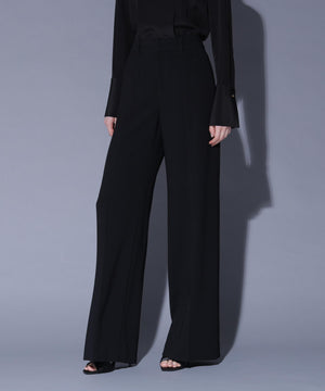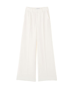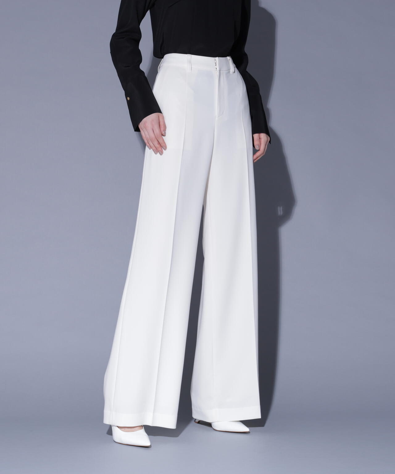 トリアセテート混のダブルクロス素材で仕立てた、上品なワイドパンツ。ハイウエストからすとんと落ちる美しいシルエットに、程よいワイド感とセンタープレスを施すことで、縦のラインが際立ち、スタイルアップ効果も。無駄のないミニマルなデザインが、大人の洗練された雰囲気を引き立てます。同素材のブラウスとのセットアップスタイルで、より一層エレガントな装いに。
