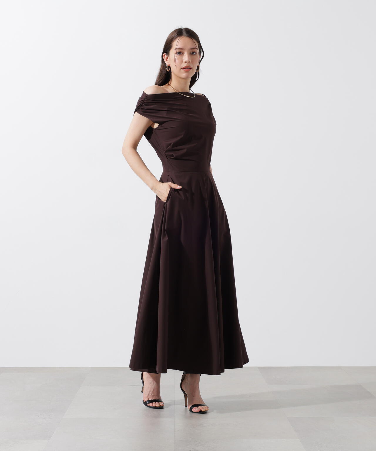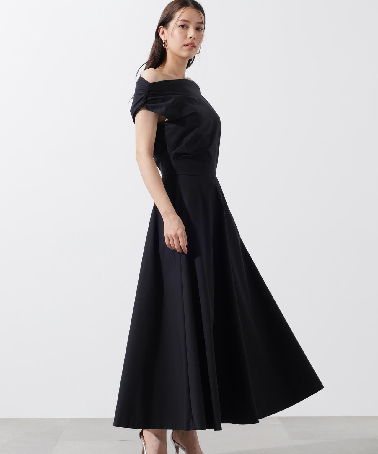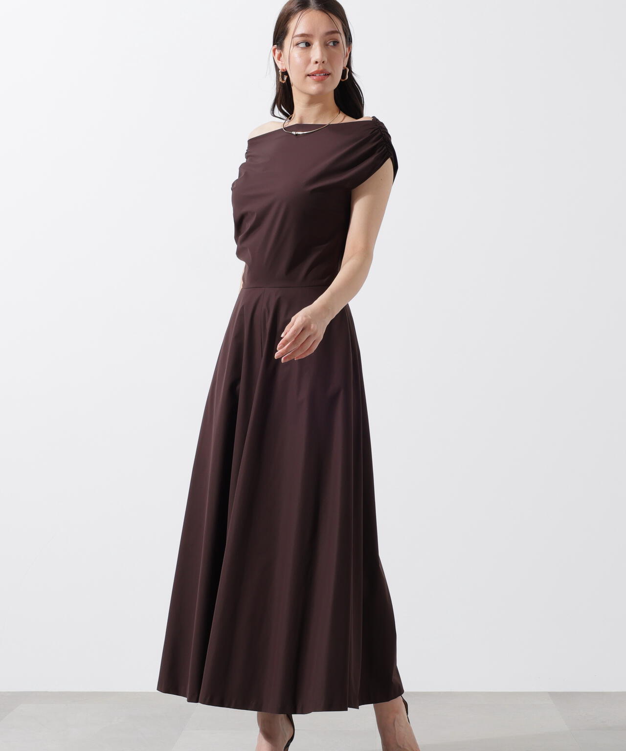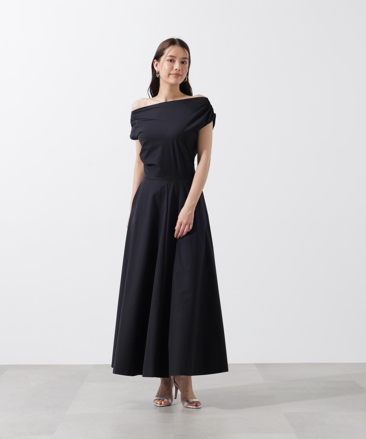 肩からウエストにかけて流れるアシンメトリーなドレープが、エレガントな雰囲気を演出。