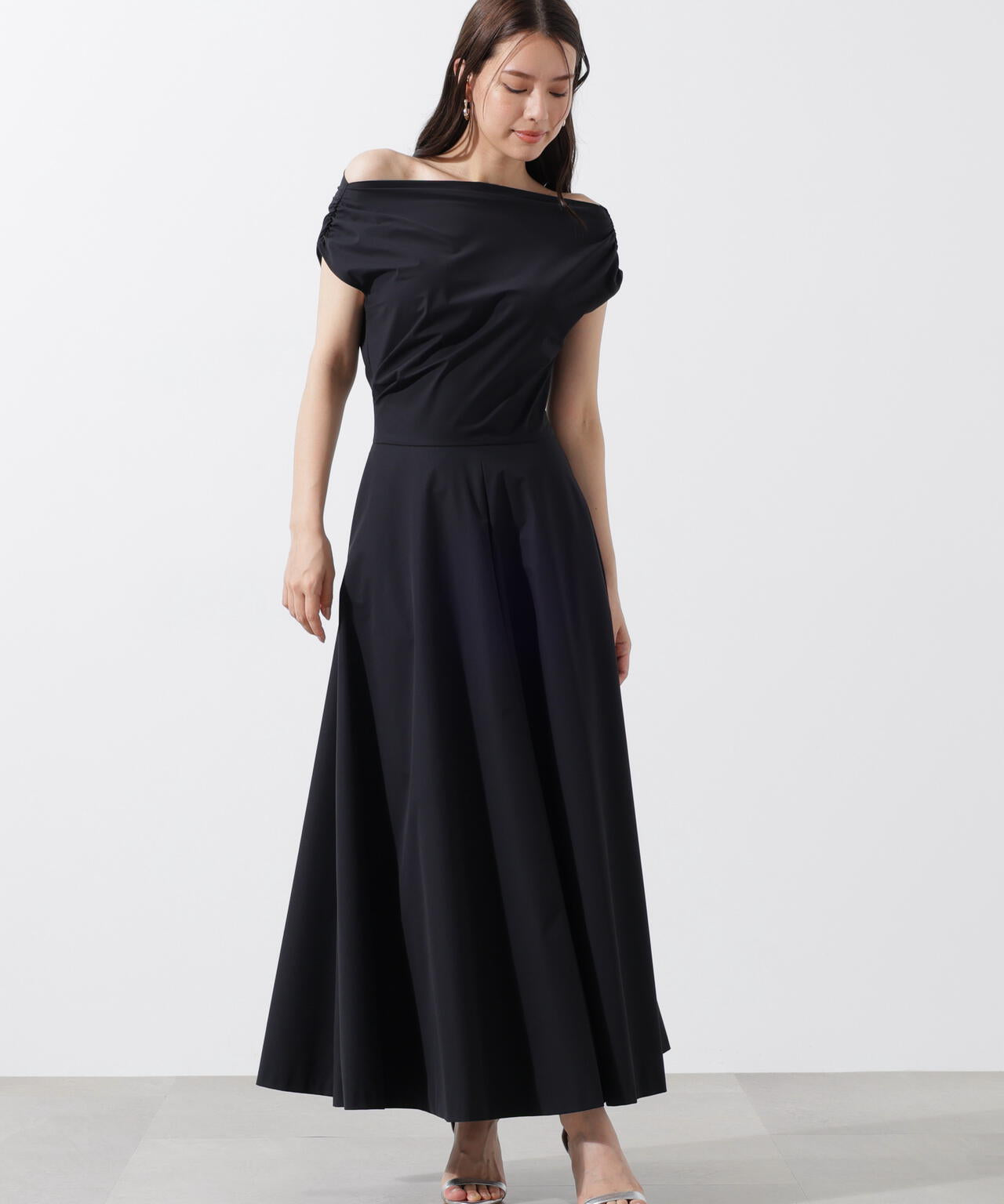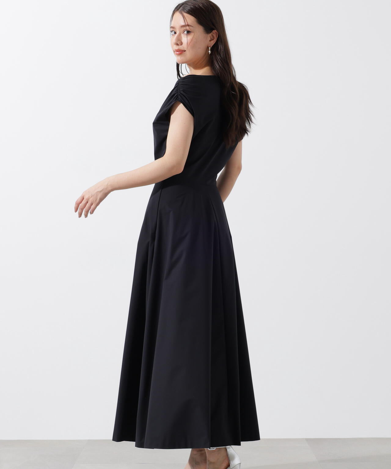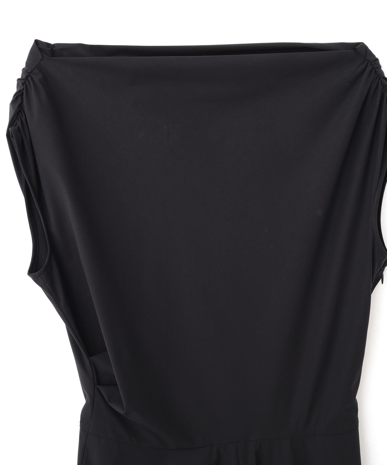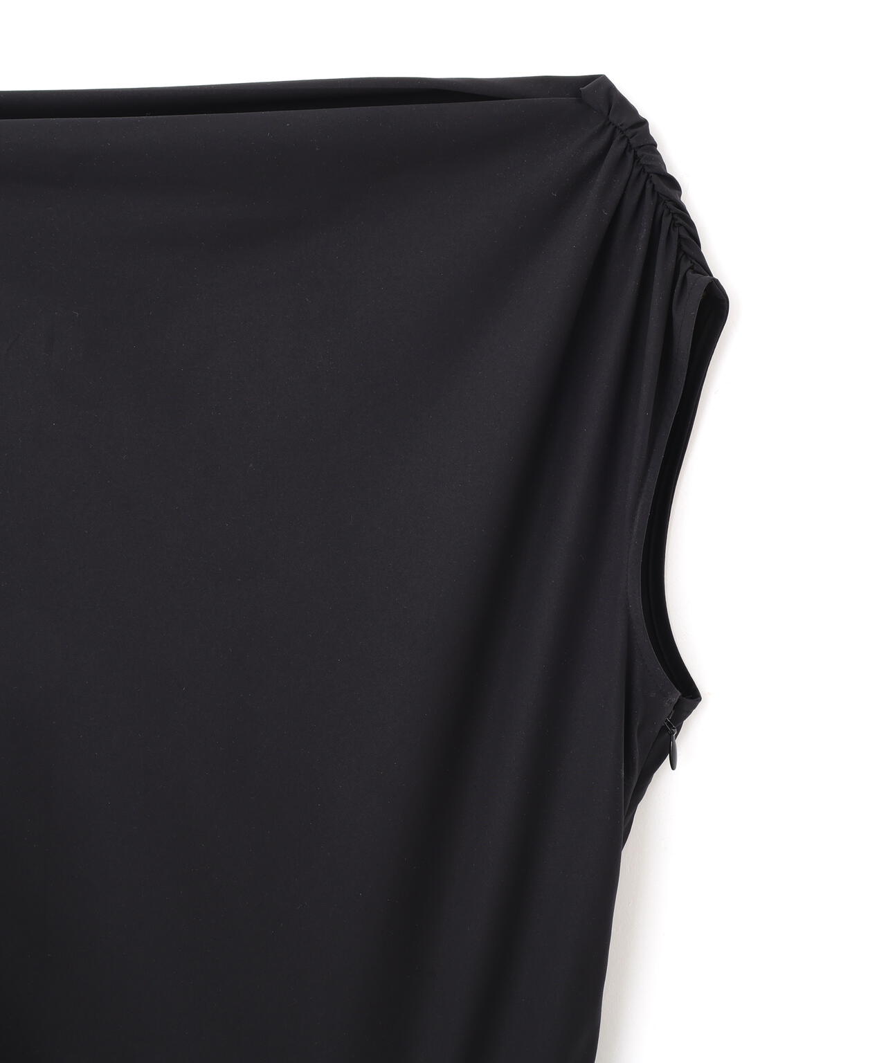 肩からウエストにかけて流れるアシンメトリーなドレープが、エレガントな雰囲気を演出。