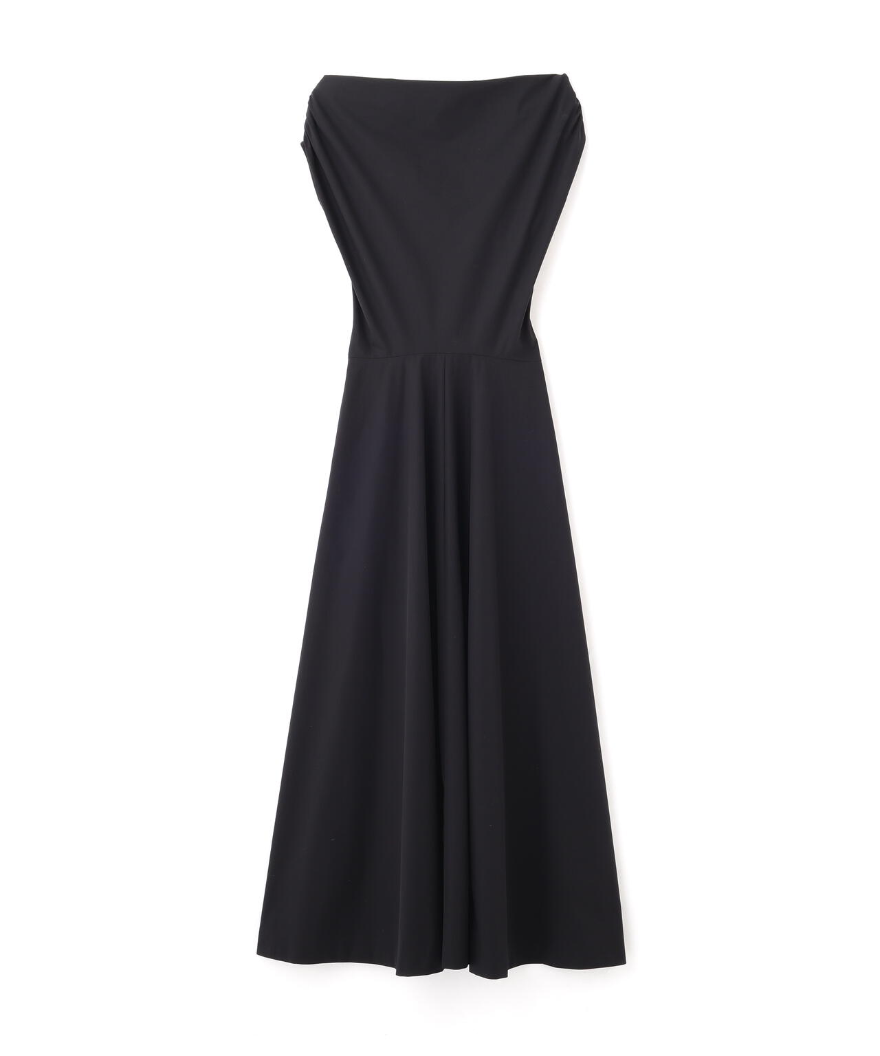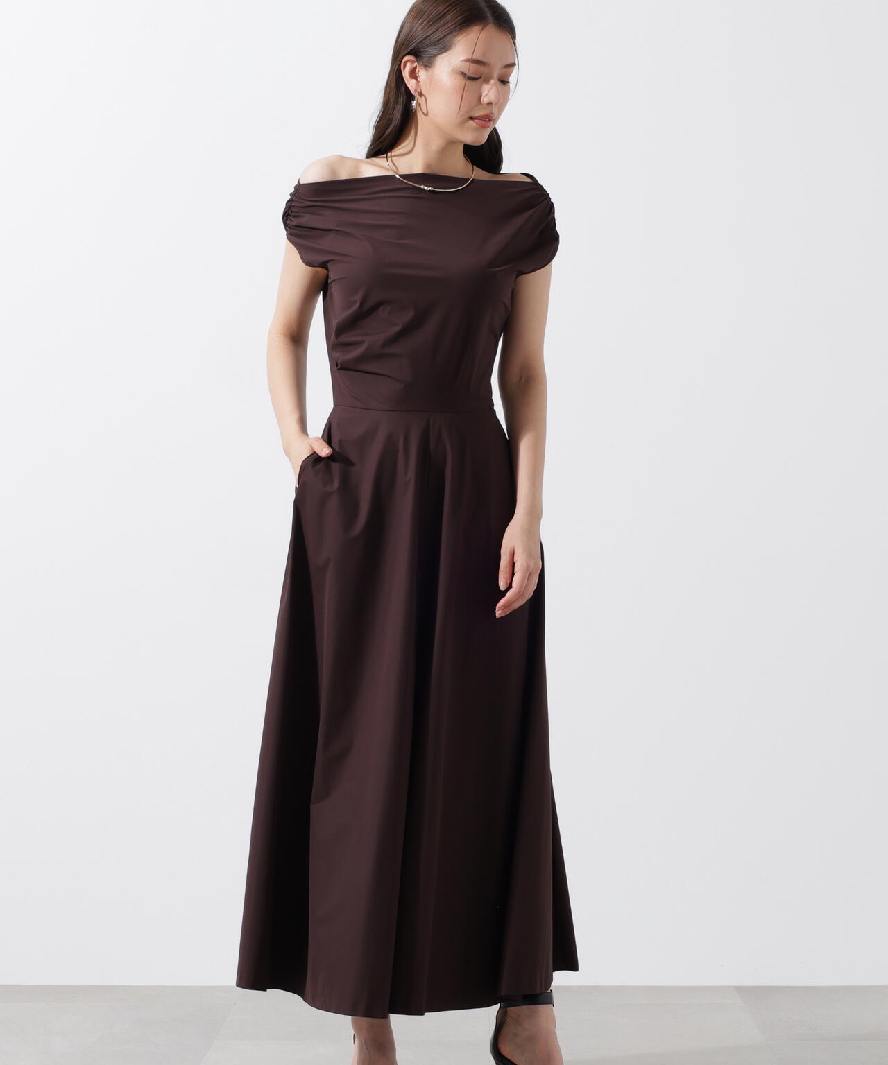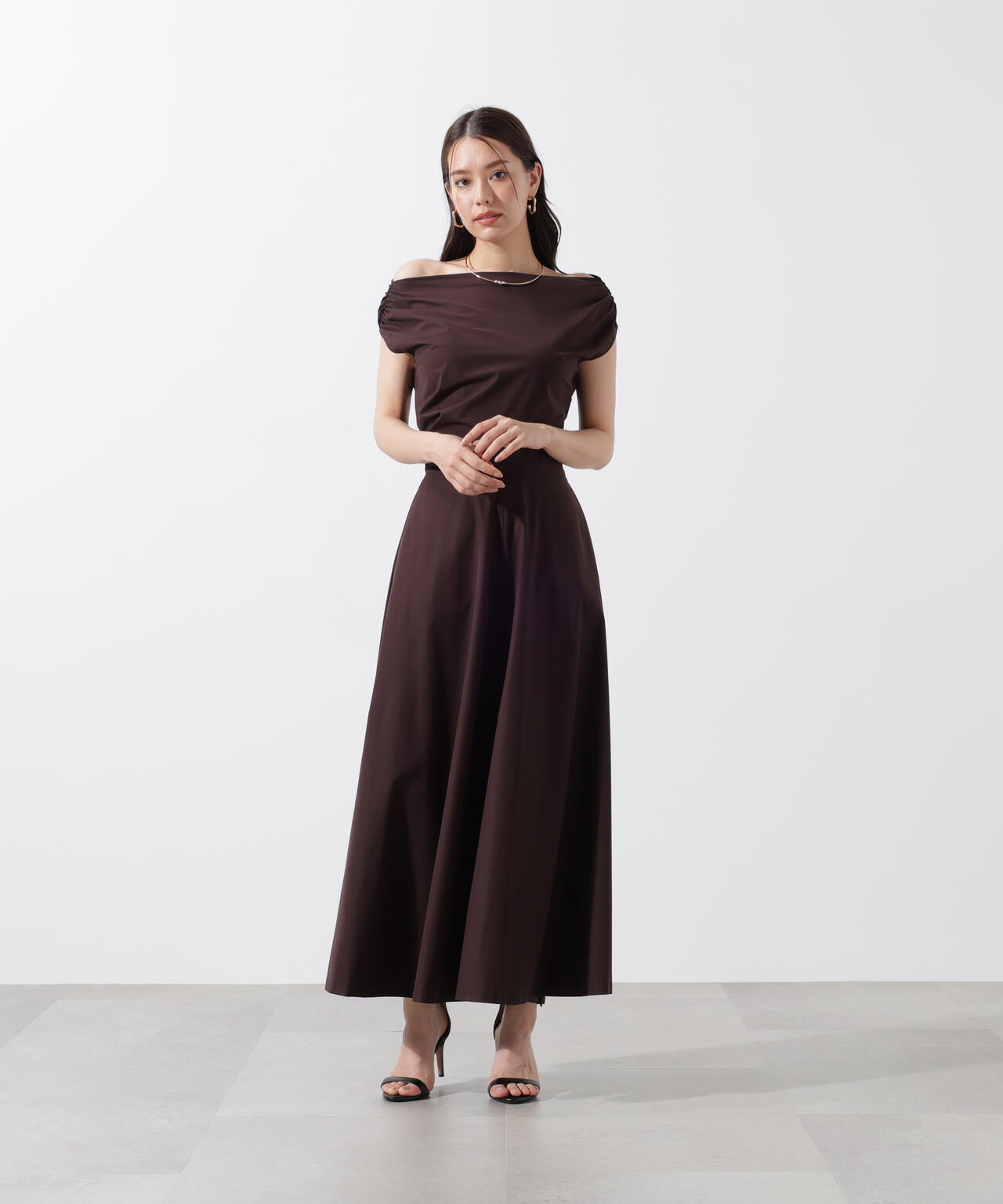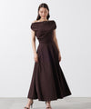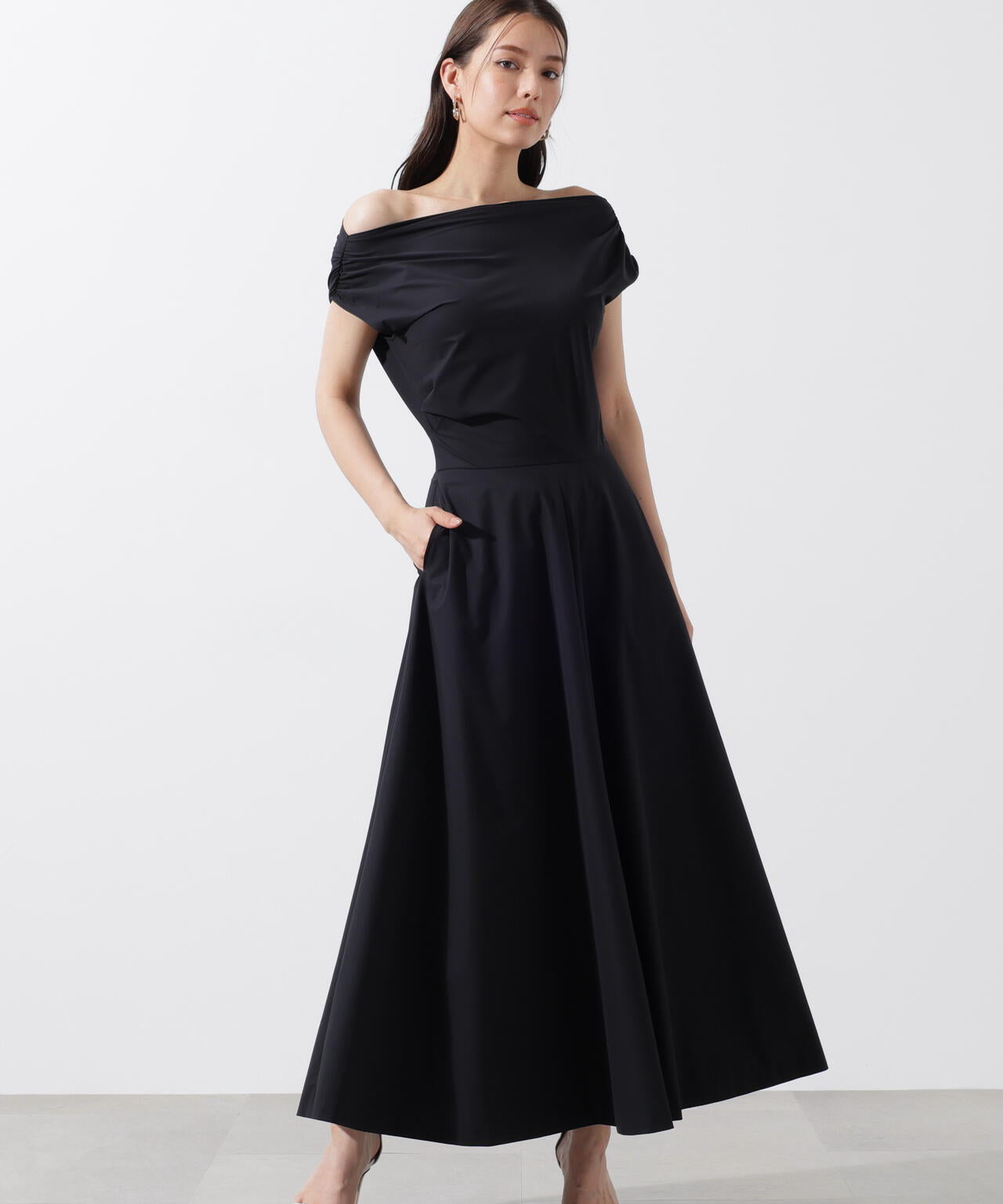 肩からウエストにかけて流れるアシンメトリーなドレープが、エレガントな雰囲気を演出。