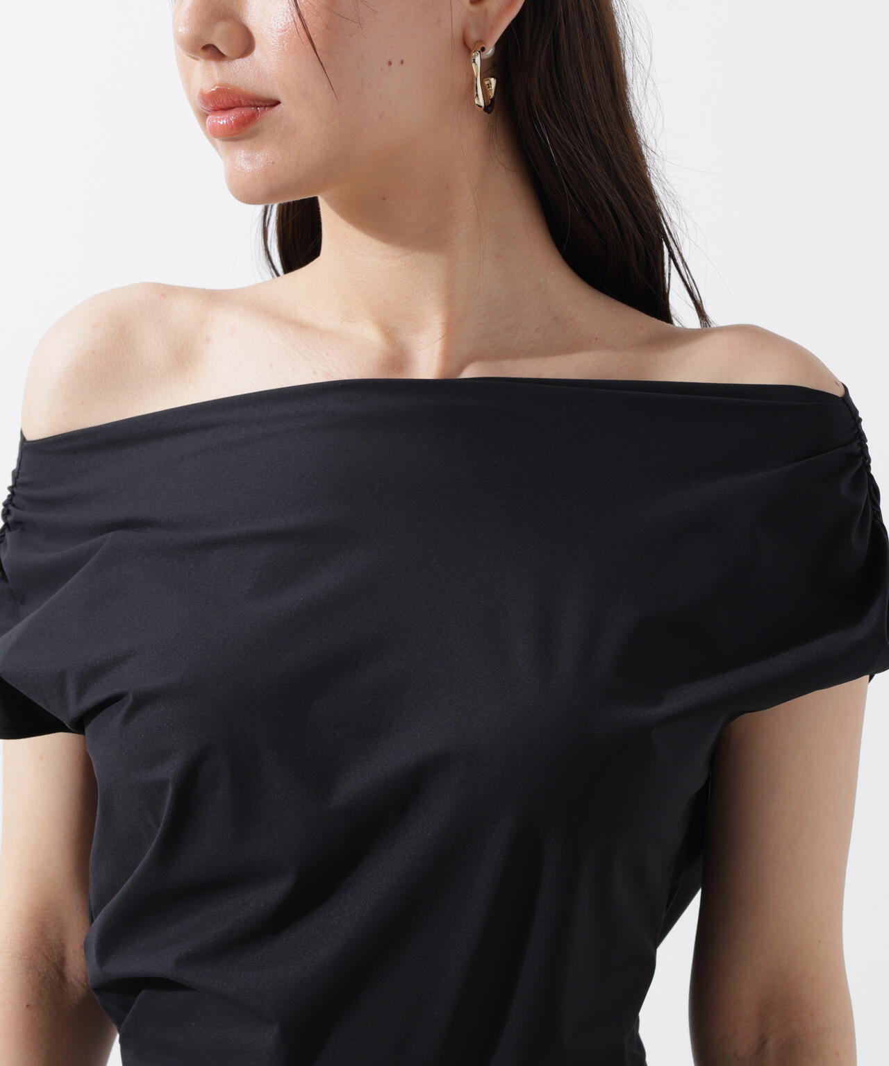 ネックまわりには程よいゆとりがあり、片側をオフショルダーにした着こなしも可能。