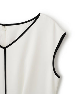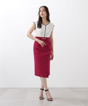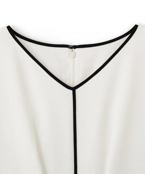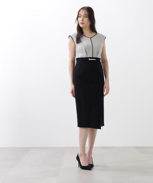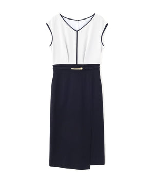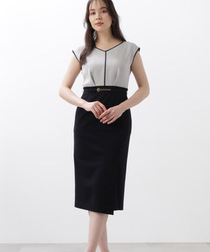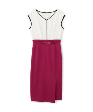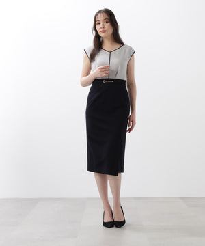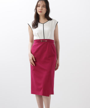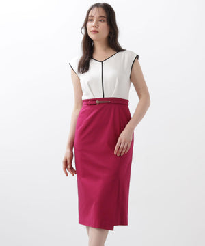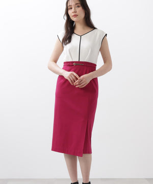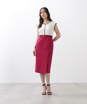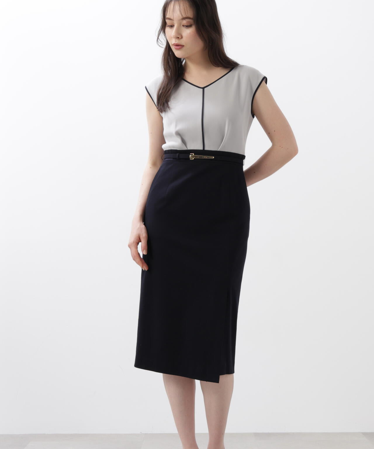ダブルツイルのブラウスとポンチのスカートのコンビワンピース。きれいめな素材のブラウスと、ストレッチ性の高いスカートのコンビで、きちんと感と着心地を両立した一着です。上半身は淡色で明るく、下半身は濃色で引き締め、メリハリを持たせました。ブラウス部分には配色のパイピングをほどこし、シャープな印象をプラス。ウエストのタックや、スカートと同素材のベルトがウエストを引き締める、スタイルアップ効果の高いワンピースです。