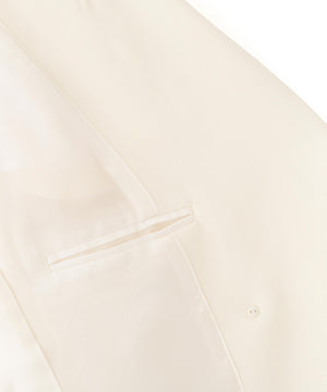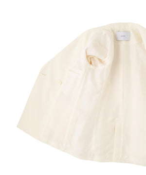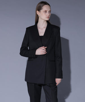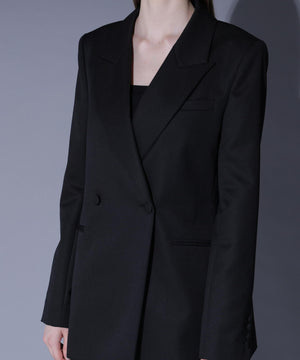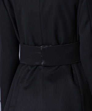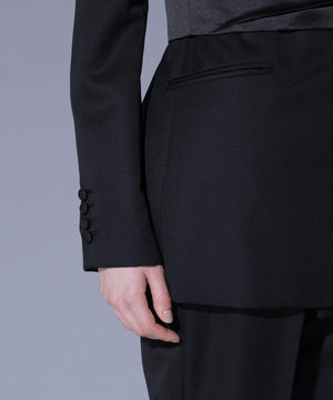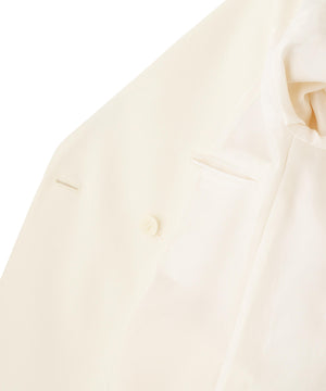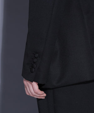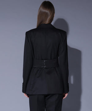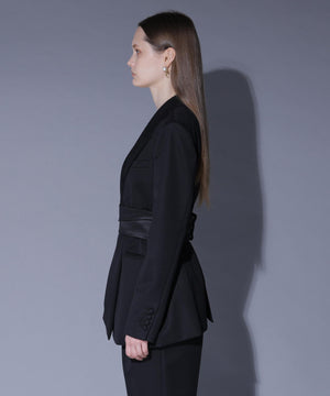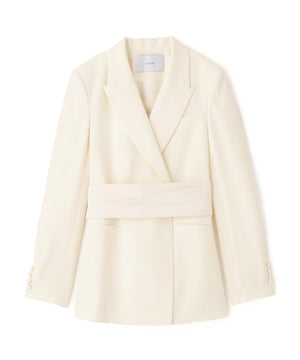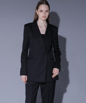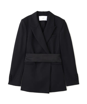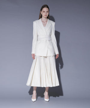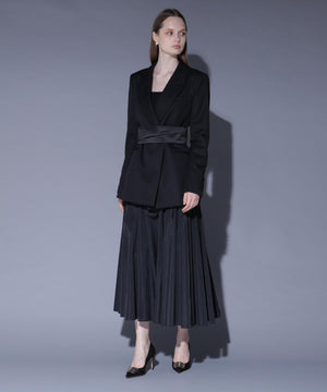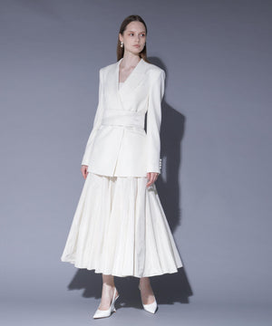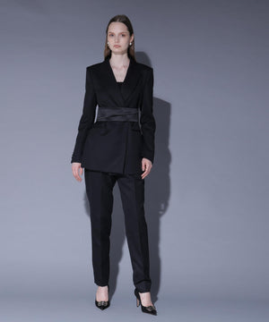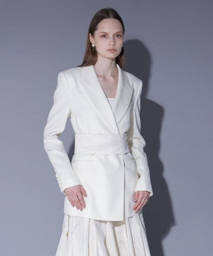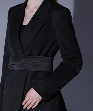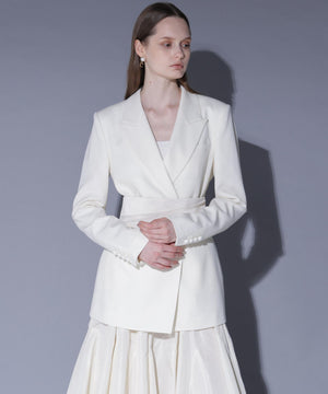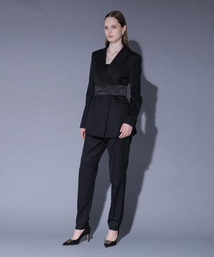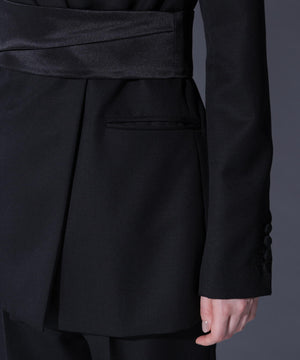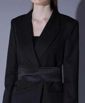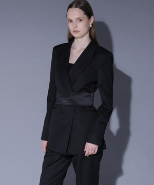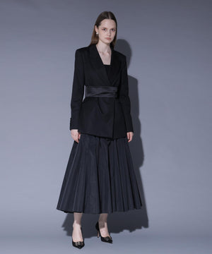 シャープなピークドラペルが印象的な、エレガンスとモードを融合させたダブルブレストジャケット。パネル切り替えによって生まれる無駄のない美しいシルエットに、肩先はシャープなラインを描く肩パッドで構築的に仕上げ、共布のくるみボタンを配して上品なアクセントをプラス。ウエストにはアシンメトリーなタックを効かせた艶やかなサテンベルトをレイヤード。あえてジャケットの上からウエストマークすることで、モード感あふれるスタイリングが完成します。