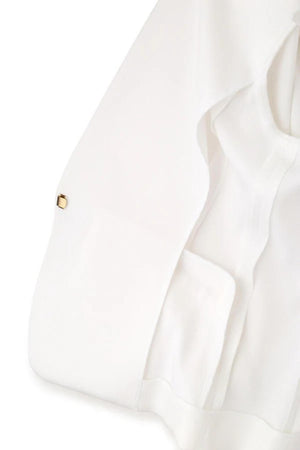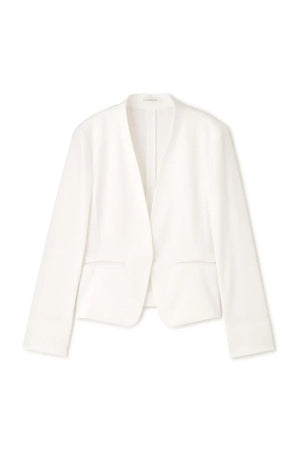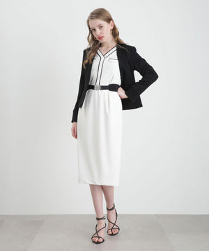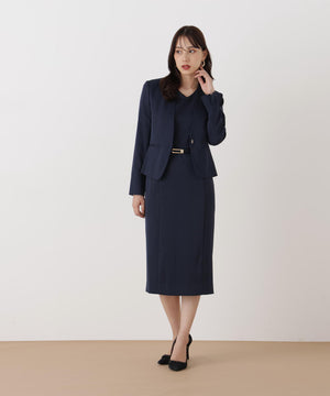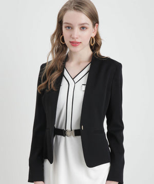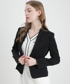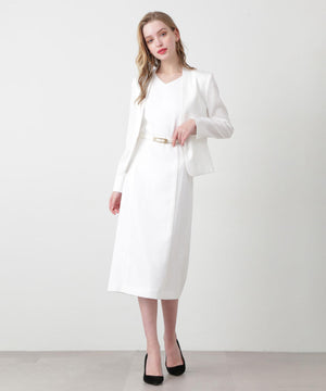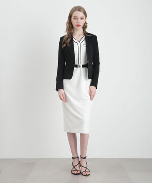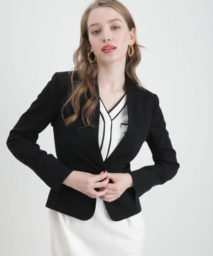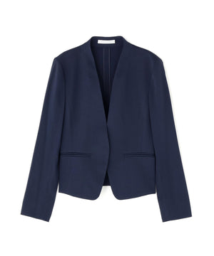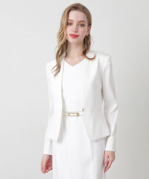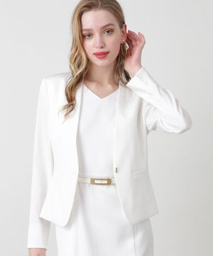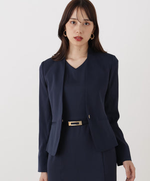 ノーカラー、ノーボタンのコンパクトな作りで、シャープな印象。無駄なデザインをそぎ落とし、すっきりとしたシルエットにこだわった、PINKY&DIANNE定番のジャケットです。今期は、前を閉めると前身頃が少しだけ重なるデザインで、開けたときにゴールドのホックがアクセントになるよう、アップデートしています。