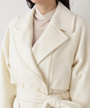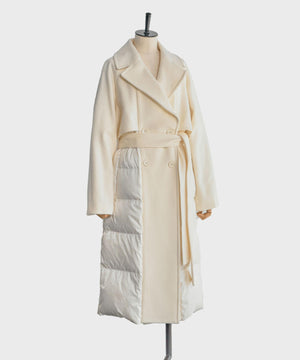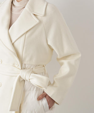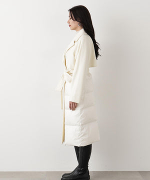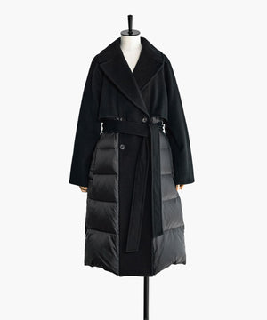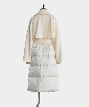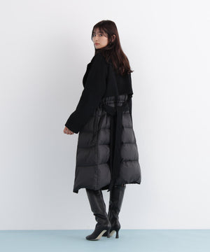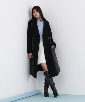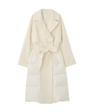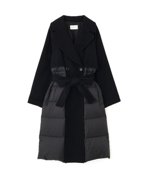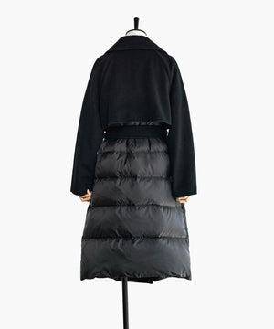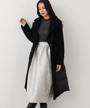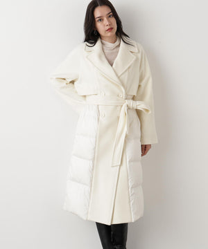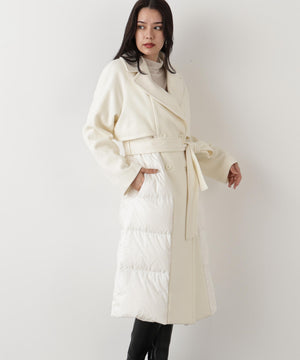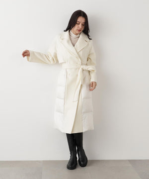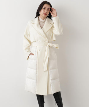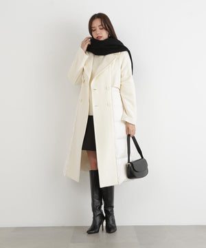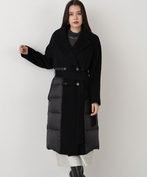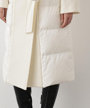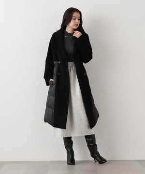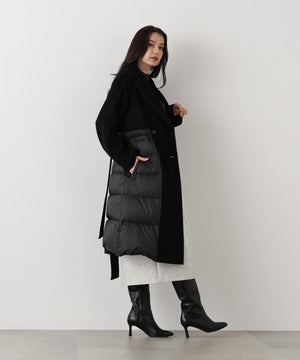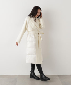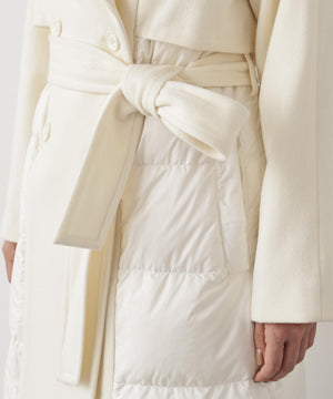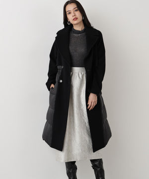 襟元に存在感を放つビッグカラーが印象的な、ウールビーバーと軽量ダウンの異素材コンビのコート。