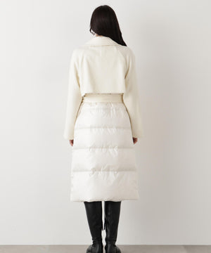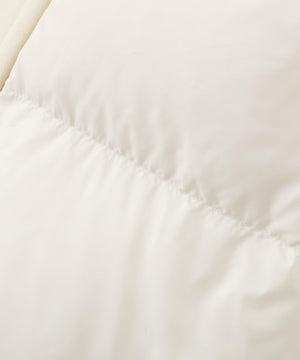 ラムウールをブレンドすることで、ふくらみのある風合いと毛並みの美しさが際立ち、なめらかで上質な仕上がりになっています。ダウン部分には軽量でごわつきのない、極薄の高密度タフタを使用。高密度でありながら、柔らかくしなやかで、上品な光沢感が特長です。