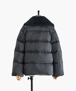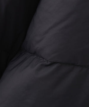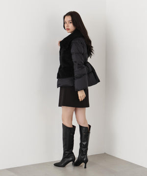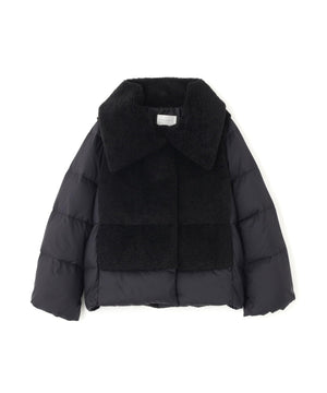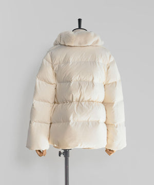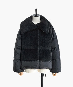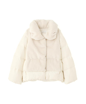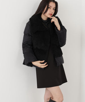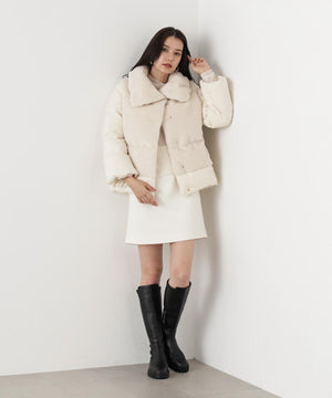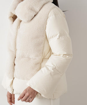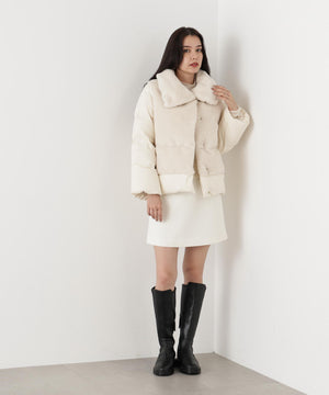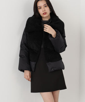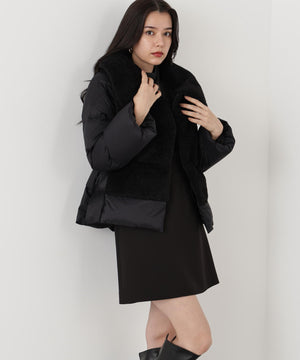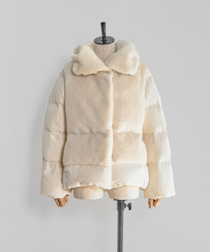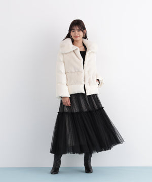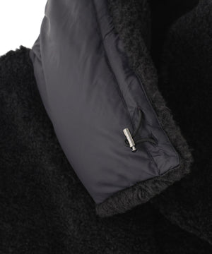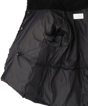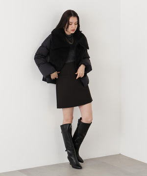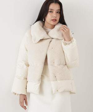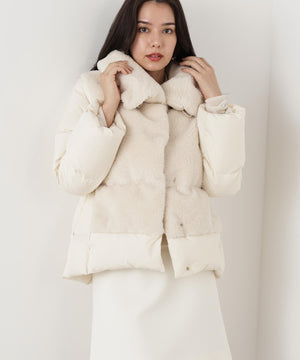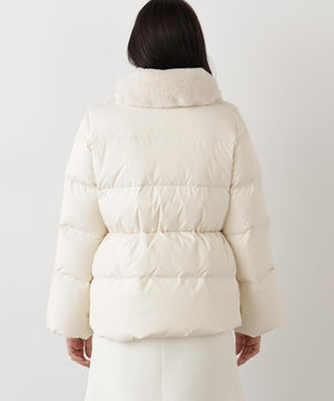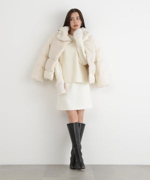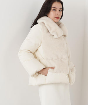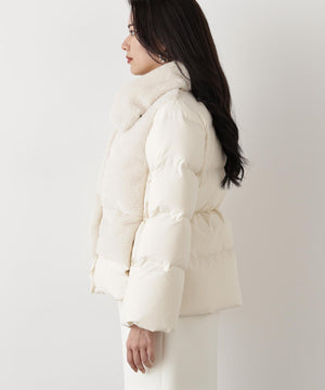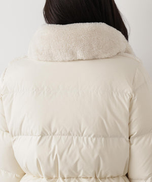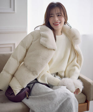 衿ぐりとボディに立体感のあるフォーファー素材を使用した、ラグジュアリーな雰囲気漂うミドル丈のダウン。