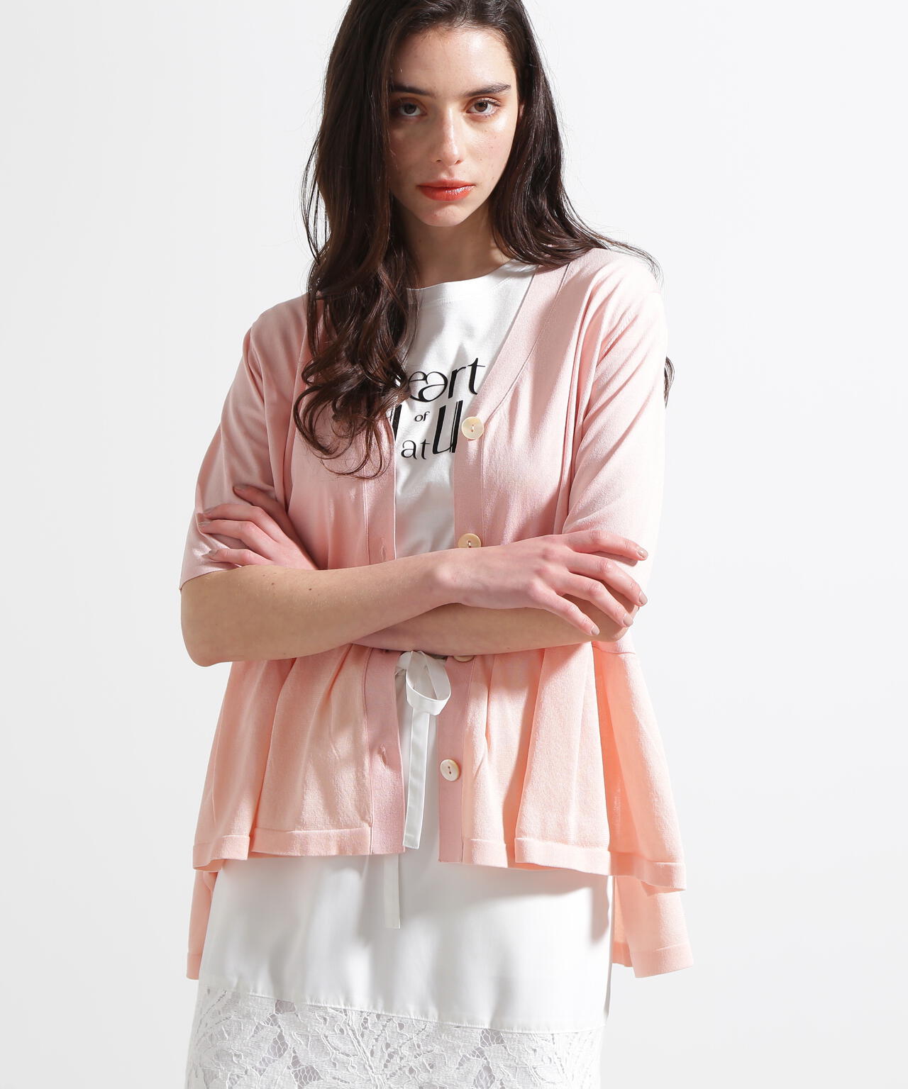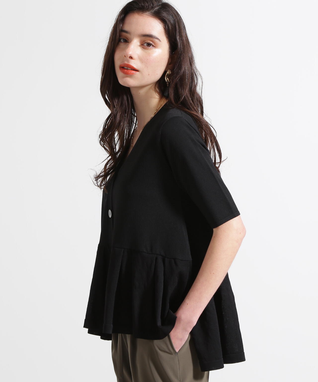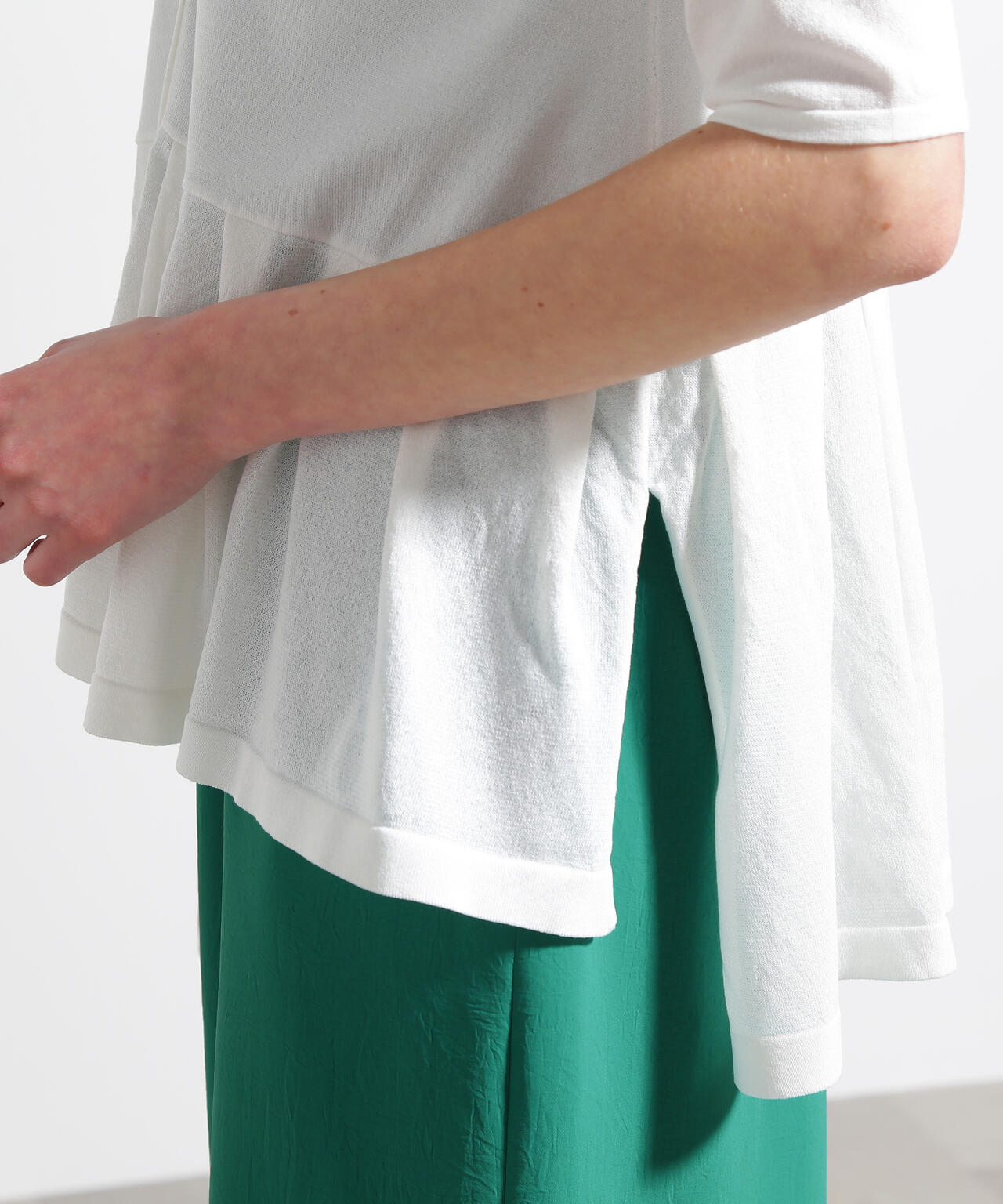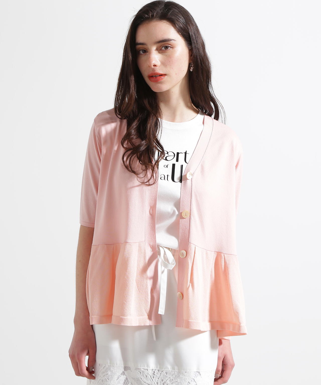 ウエストから下の部分を布帛の透け感のあるニット糸を使用して裾にかけてフレアを入れたカーディガン。ストレッチ性のある糸で、光沢感があり目面も良く上品な仕上がりが特徴の糸を使い、総針編みのしっかりした肉感を出しています。また、ややウエストの位置を高めに設定することでスタイルアップ効果もある商品です。サイドスリットが入っていて着用頂くと、裾にうごきがでます。