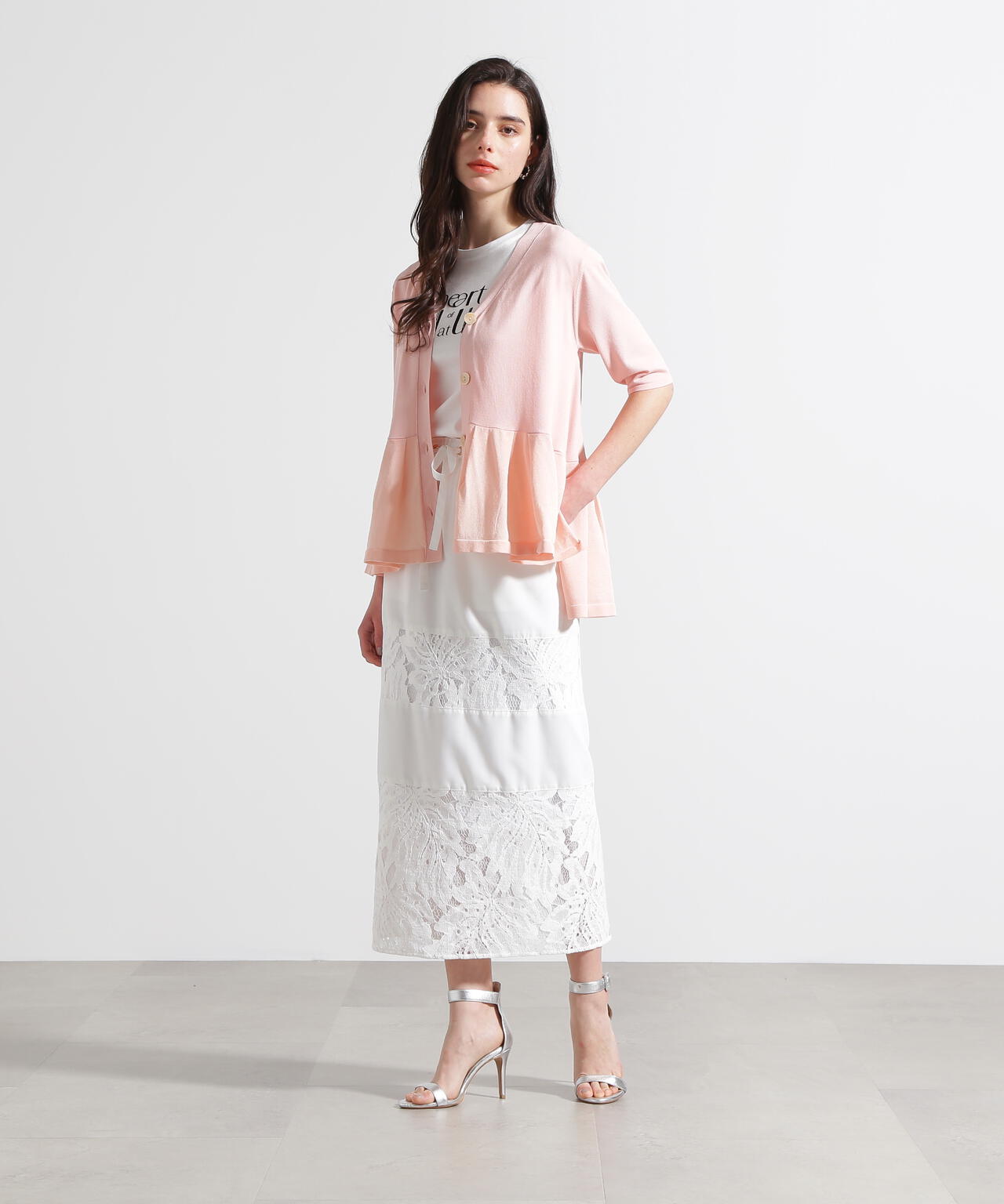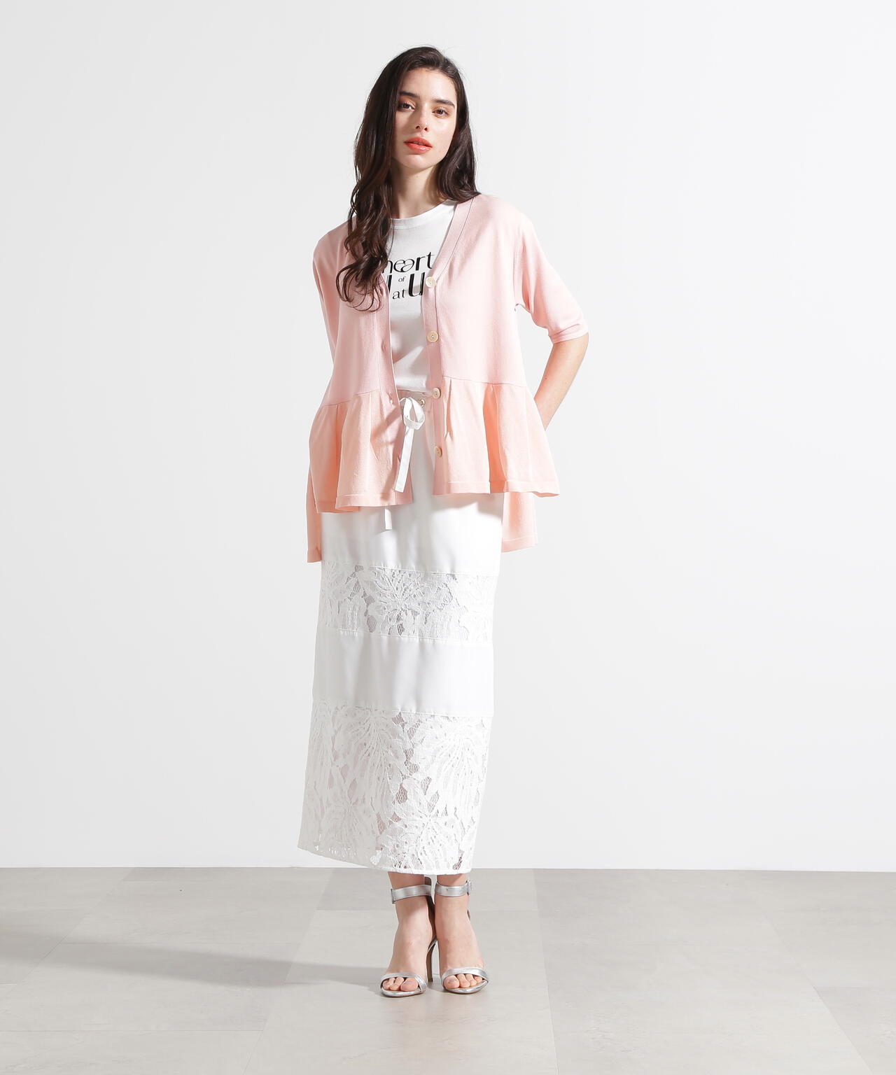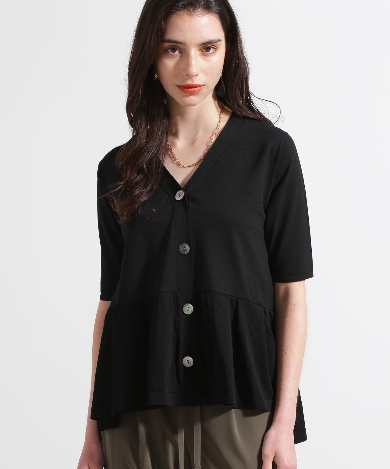 ウエストから下の部分を布帛の透け感のあるニット糸を使用して裾にかけてフレアを入れたカーディガン。ストレッチ性のある糸で、光沢感があり目面も良く上品な仕上がりが特徴の糸を使い、総針編みのしっかりした肉感を出しています。また、ややウエストの位置を高めに設定することでスタイルアップ効果もある商品です。サイドスリットが入っていて着用頂くと、裾にうごきがでます。