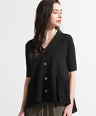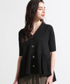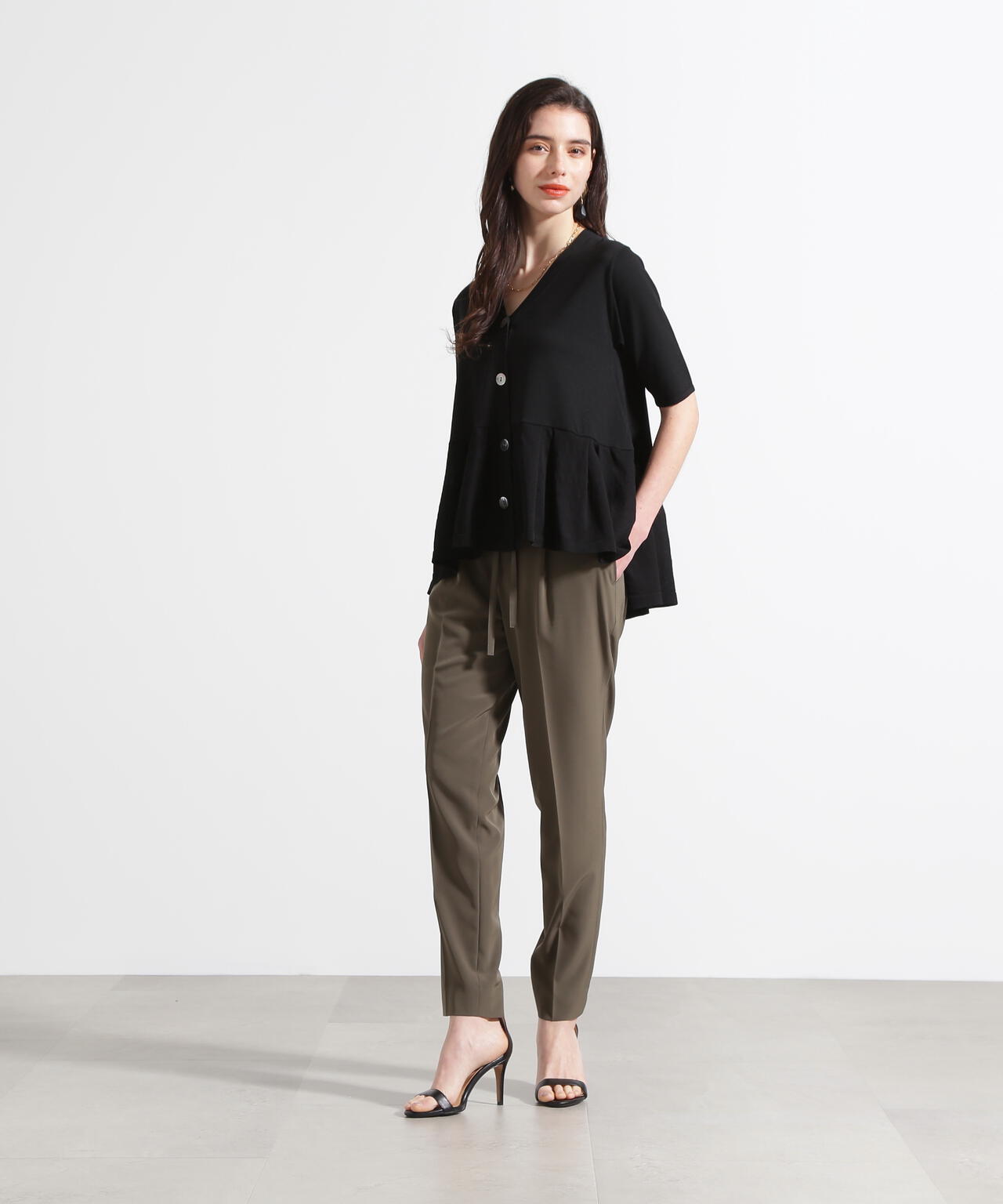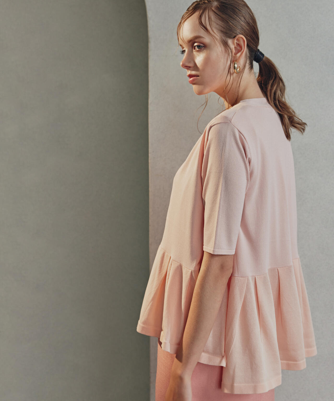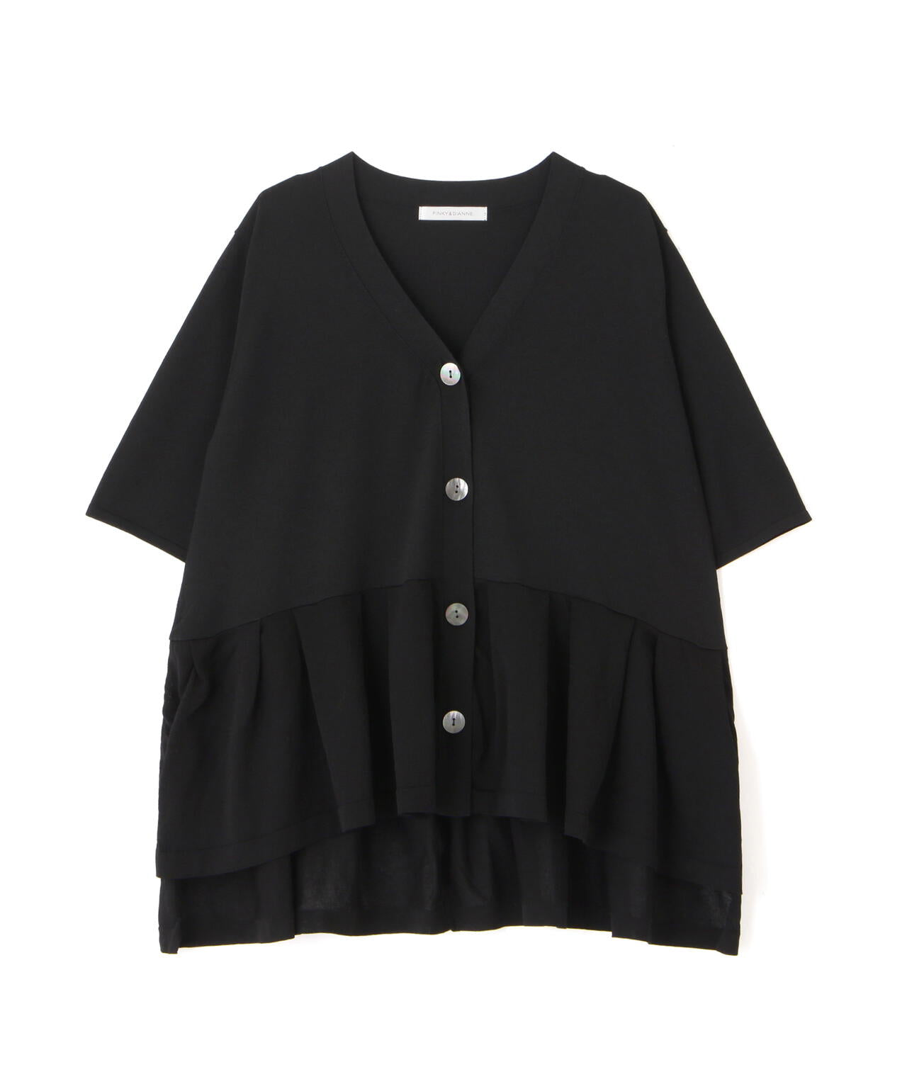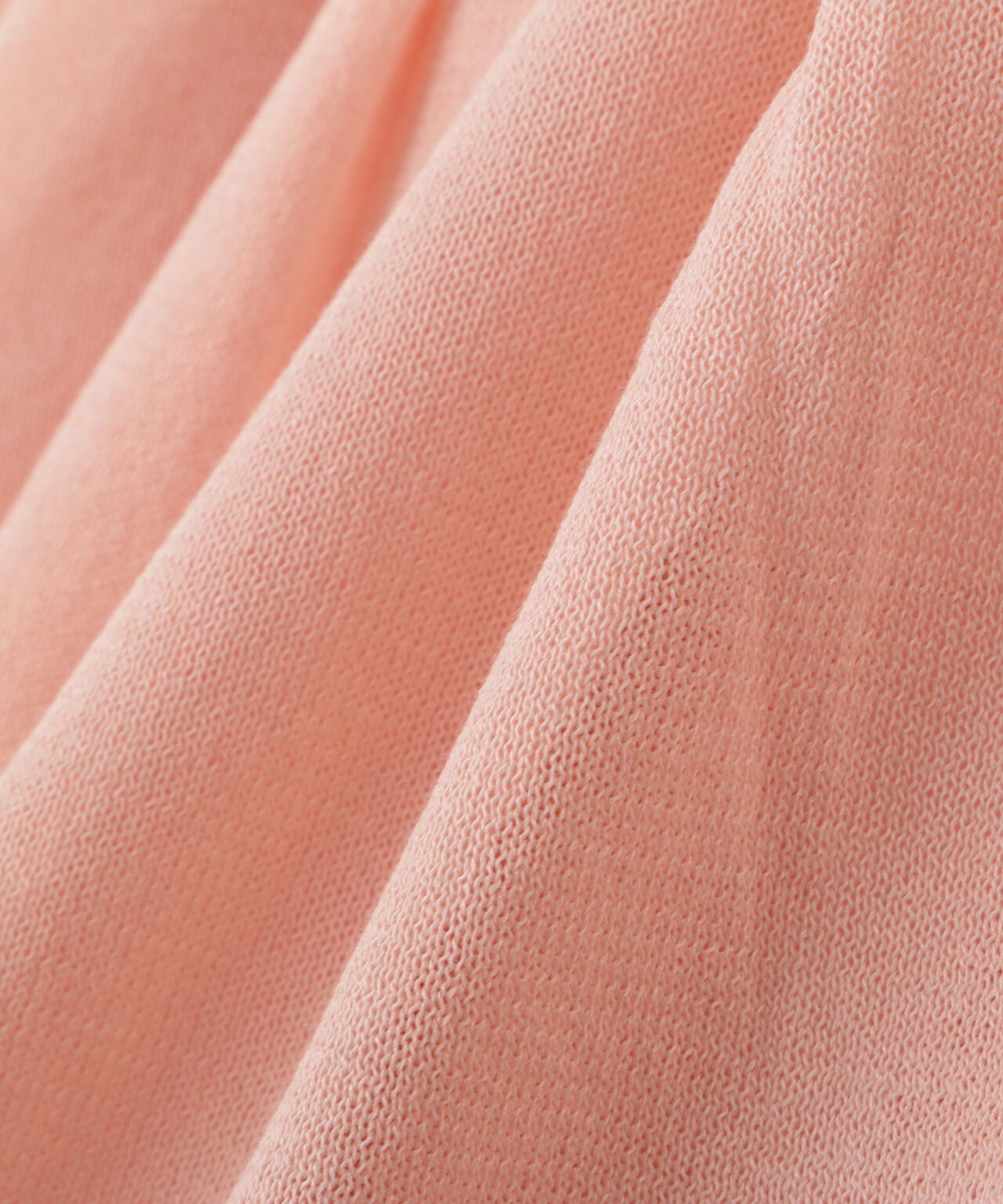 ウエストから下の部分を布帛の透け感のあるニット糸を使用して裾にかけてフレアを入れたカーディガン。ストレッチ性のある糸で、光沢感があり目面も良く上品な仕上がりが特徴の糸を使い、総針編みのしっかりした肉感を出しています。また、ややウエストの位置を高めに設定することでスタイルアップ効果もある商品です。サイドスリットが入っていて着用頂くと、裾にうごきがでます。