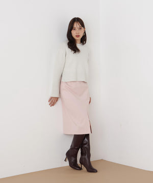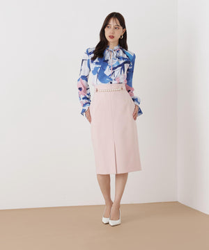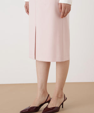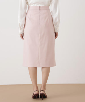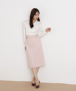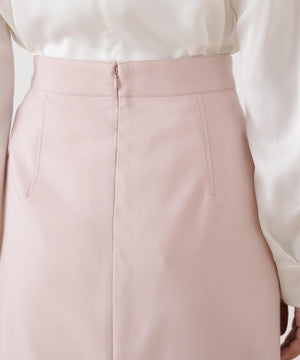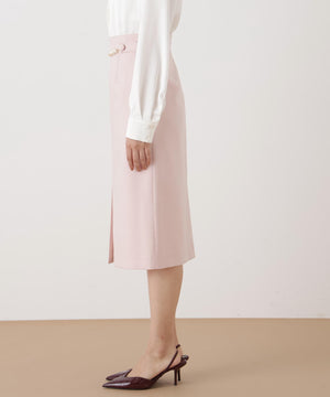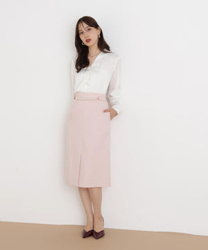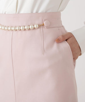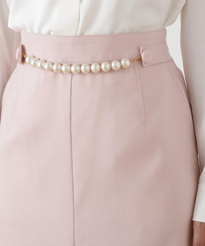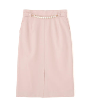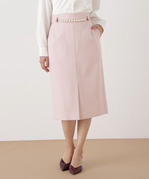 ウール混の温かみある素材で仕立てたタイトスカート。ハイウエストから続くすっきりとしたラインが女性らしいシルエットを描き、ウエストにあしらった大ぶりのパールビーズ飾りが華やかな印象を添えます。パールビーズは取り外し可能で、外してもサイドのタブとボタンがアクセントとなり、シンプルながらも洗練された雰囲気に。オフィスから華やかなシーンまで幅広く活躍する一着です。