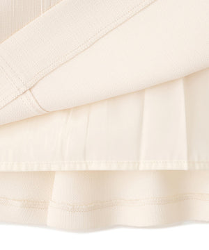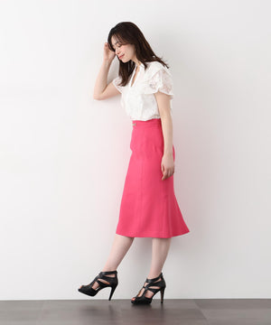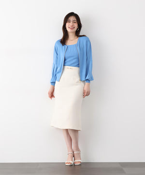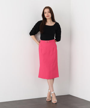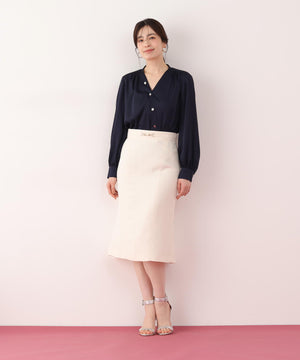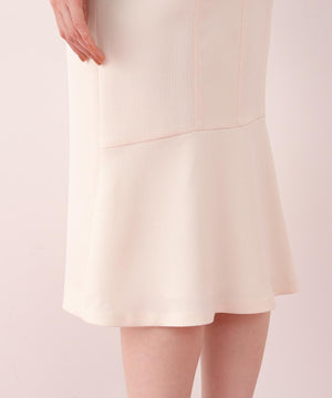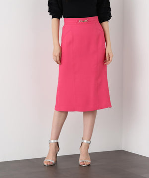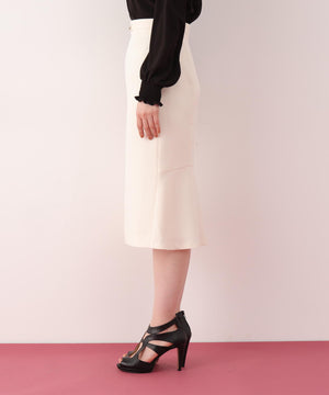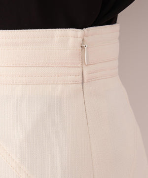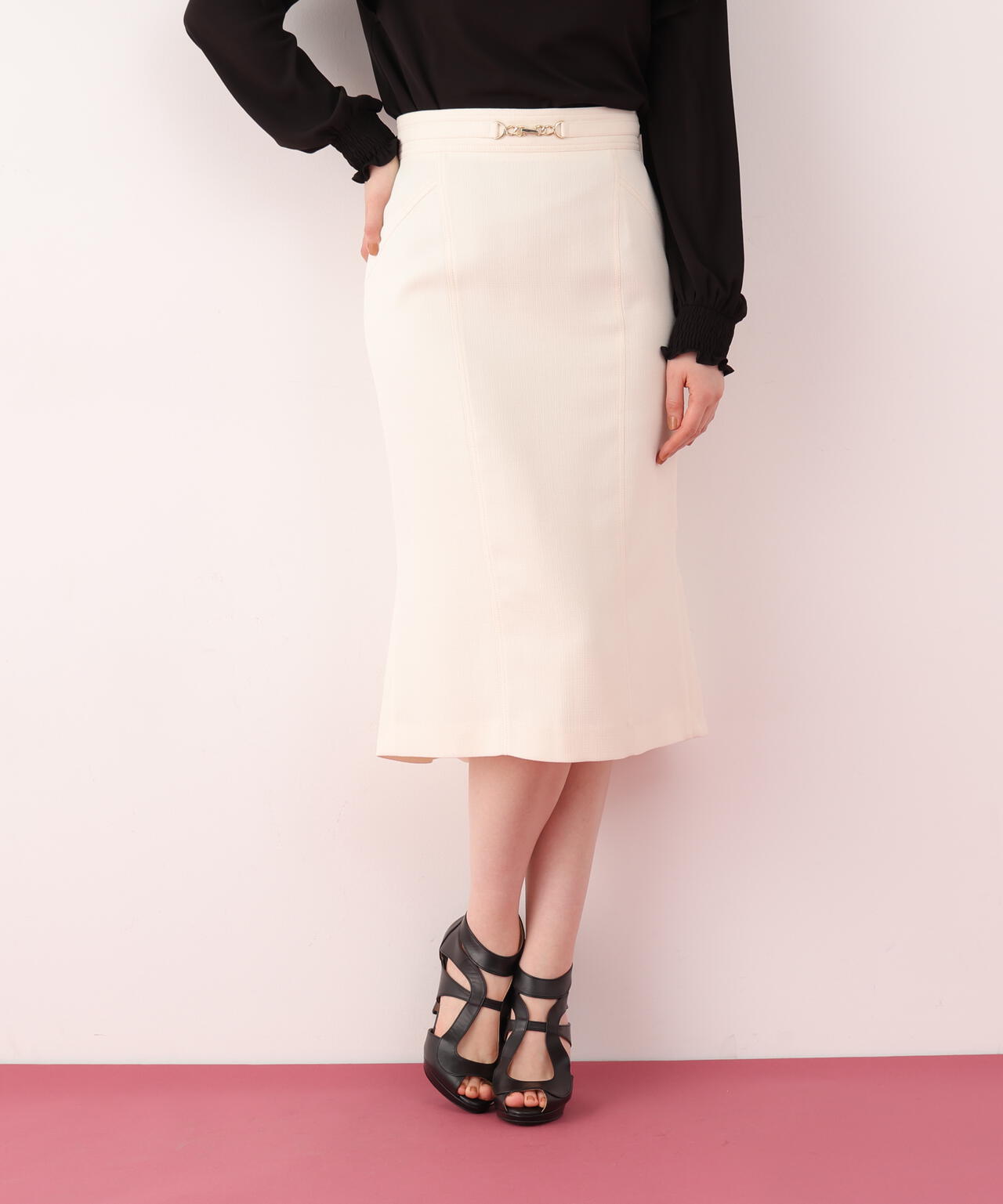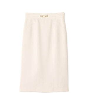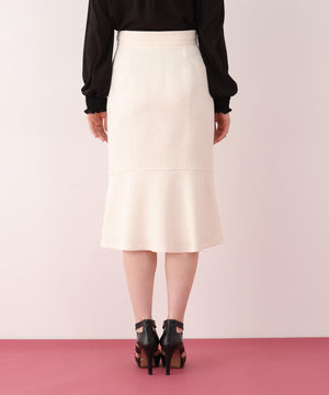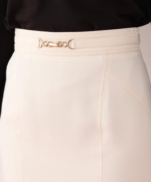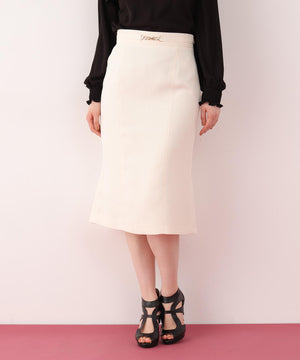 ブッチャー組織の素材で仕立てた、メタルパーツがポイントになったのタイトバックメードスカート。中空糸ならではの驚くほどの軽さに、ブッチャー特有の表面の凹凸感が加わり、上品な立体感を生み出します。フロントはすっきりとしたタイトシルエットで、腰まわりをきれいに見せる切替デザインを採用。後ろ裾にはマーメイド風のフレアパネルを配し、歩くたび控えめに揺れる華やかさと足さばきの良さを両立しています。