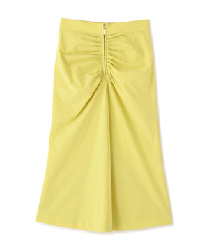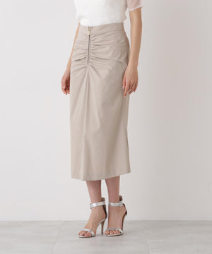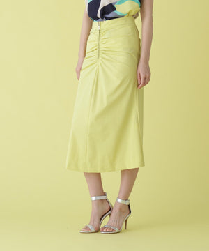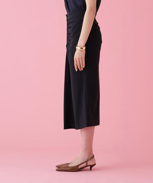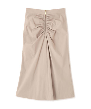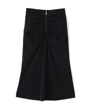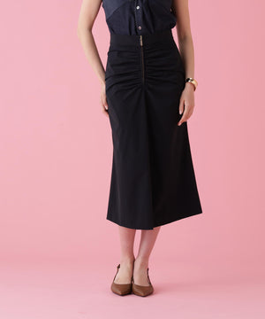 フロントはジップデザインでシャープな印象に仕上げ、放射線状にあしらったタックギャザーが華やかさをプラス。ヒップはすっきりとタイトに、裾にかけてやや広がる女性らしいシルエットが印象的なスカートです。2WAYストレッチ素材で、快適な着心地も兼ね備えています。