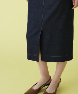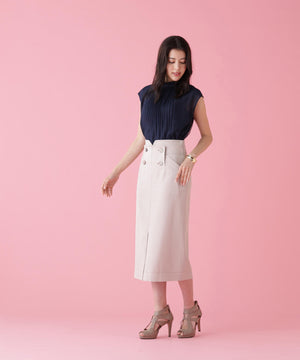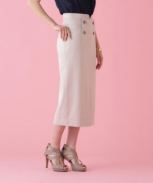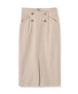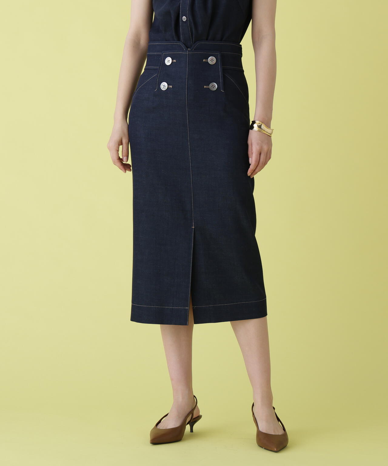 フロントにマリンディティールを利かせたタイトシルエットのミモレ丈スカート。ウエストは高めの位置で設定しているので脚長効果も期待でき、すっきりとお召しいただけます。艶のあるシェルボタンがカジュアル過ぎない大人の雰囲気を与え、フロント裾に深めに入ったベンツあきが、足さばきも良く抜け感もプラスしてくれます。