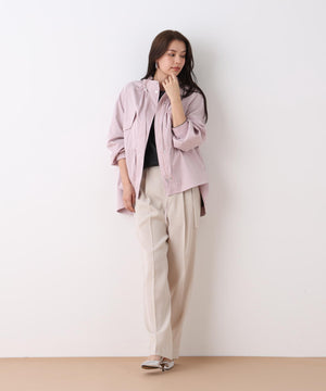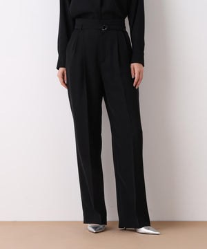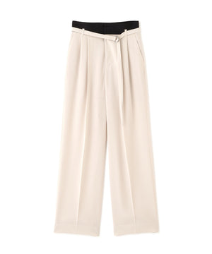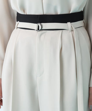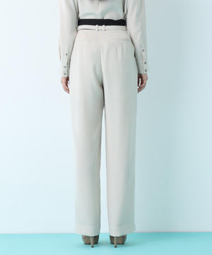 程よい肉感と美しいドレープ性を兼ね備えたダブルサテンを使用したパンツ。ウエストには2タックを入れ、程よいゆとりを持たせながらも、センタープレスが縦のラインを強調し、シャープですっきりとしたシルエットに仕上げています。さらに、ウエストに別生地を配することで、ウエストまわりをすっきりとした印象に整えた上品な一本です。