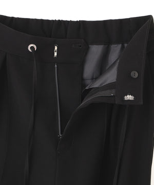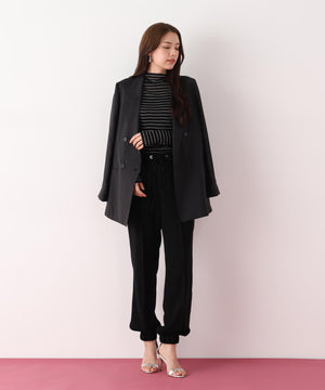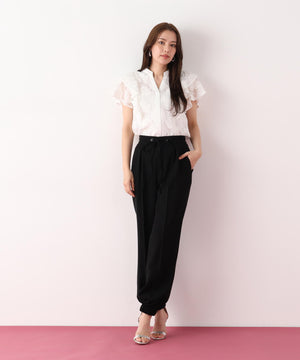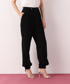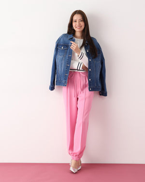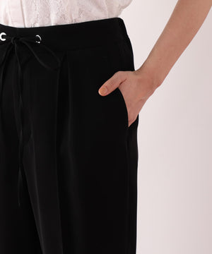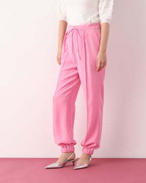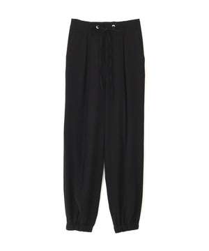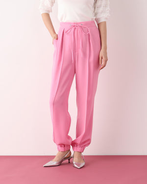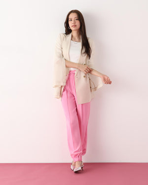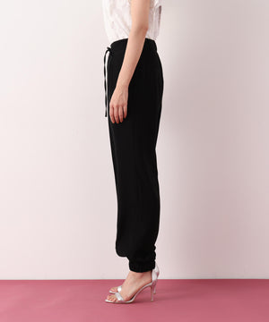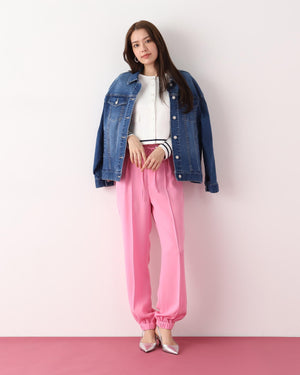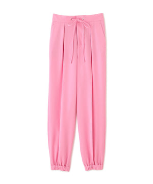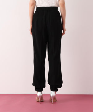 シルキーなタッチが魅力のツイルダブルクロスを使用したジョガーパンツ。ややゆったりとしたシルエットながら、センターシームが縦のラインを強調し、すっきりとした印象に仕上げています。ウエスト後ろはゴム仕様でリラックス感があり、前はスピンドルデザインがアクセントとなり、トップスインのスタイリングをシャープに魅せます。ベーシックな黒に加え、スタイリングに華やぎを添えるピンクカラーもおすすめです。