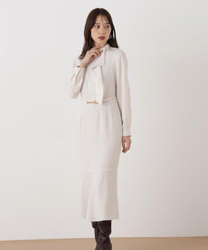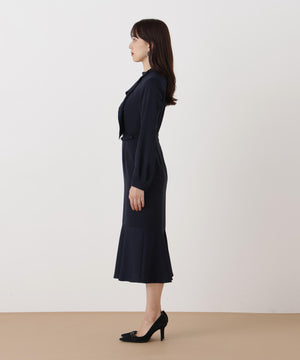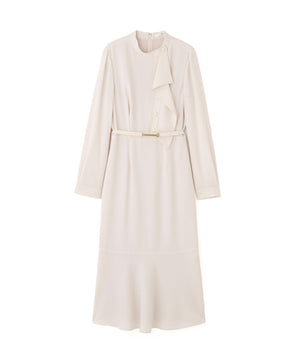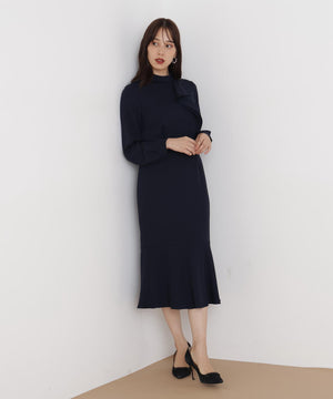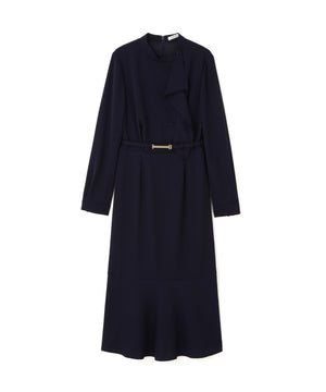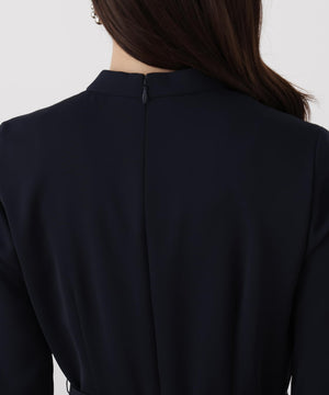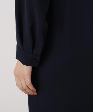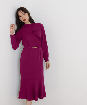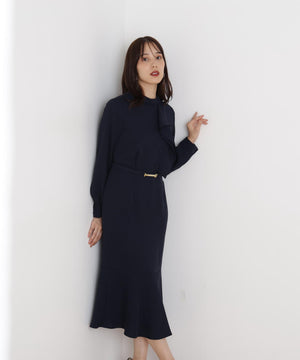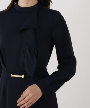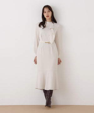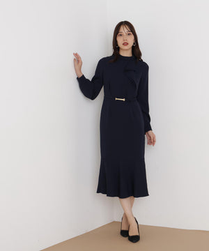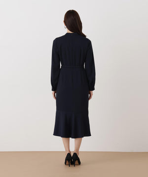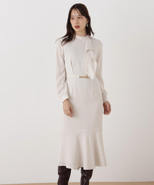 上品で洗練された印象を与える、ラッフルロングスリーブワンピース。柔らかな落ち感のある生地が、女性らしいシルエットを美しく演出します。胸元にあしらわれた控えめなフリルディテールが華やかさを添え、ウエストの細ベルトがスタイルアップを叶えます。オフィスシーンからフォーマルな場まで幅広く活躍する、シンプルながらも存在感のある一着です。