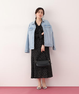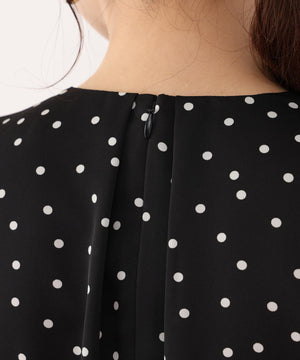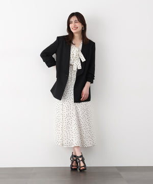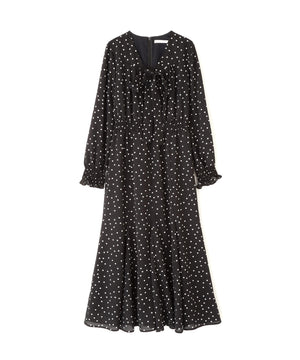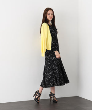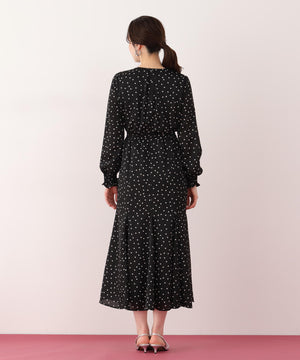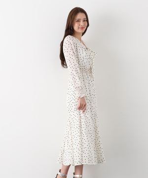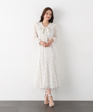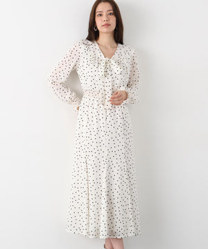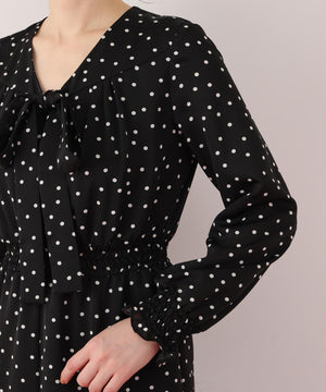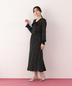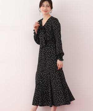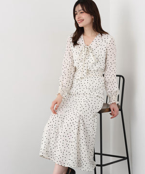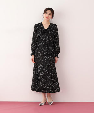 ランダムドットプリントがフェミニンな印象を引き立てるワンピース。顔まわりをすっきり見せるVネックに、胸元のリボンが上品で華やかなアクセントを添えます。スカートはヒップラインをすっきりと見せつつ、裾に向かって軽やかに広がるマーメードシルエットに。ウエストと袖口のゴムシャーリングが全体をほどよく引き締めた、上品さと女性らしさを兼ね備えた一着です。