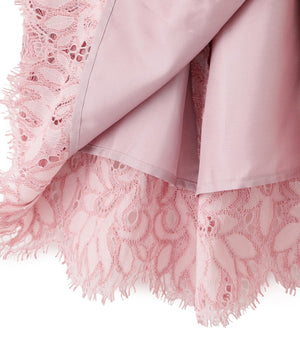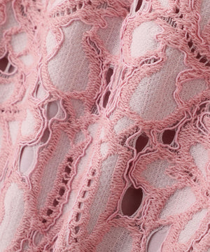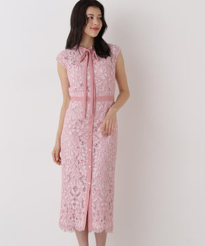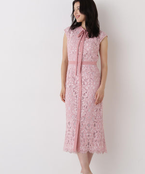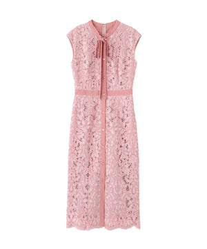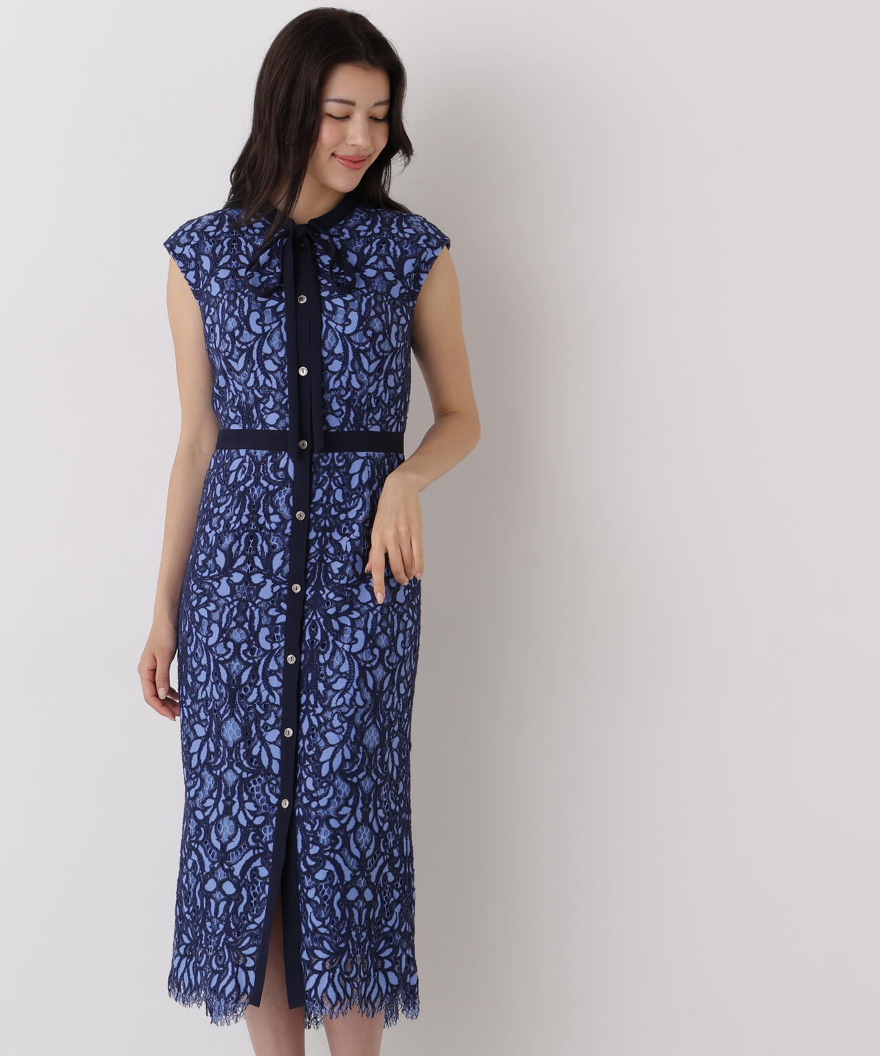 身体のラインに程よく沿った細身のシルエットが女性らしい雰囲気のレースワンピース。スタンドカラーが凛とした印象で細めのリボンをあしらうことで更に女性らしさもプラス。襟と前立て、ウエストを無地で切り替える事によりメリハリを与え、すっきりとした印象に仕上げました。ヒップ下で切り替えマーメイドラインを出した、後ろ姿も女性らしいシルエットのワンピースです。
