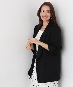 ややゆったりとしたシルエットにパネル切り替えを施し、縦ラインを強調してすっきり見せるショールカラージャケット。ショールカラーがほどよいきちんと感と女性らしさを演出します。